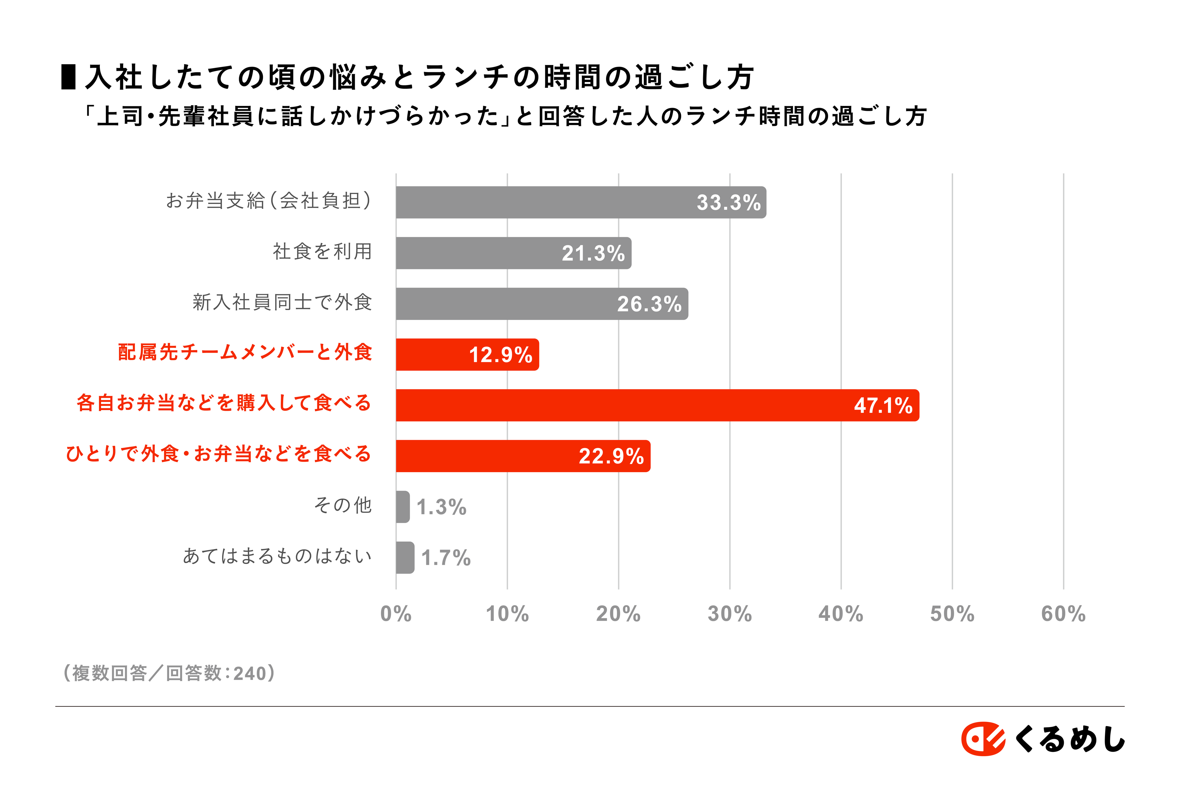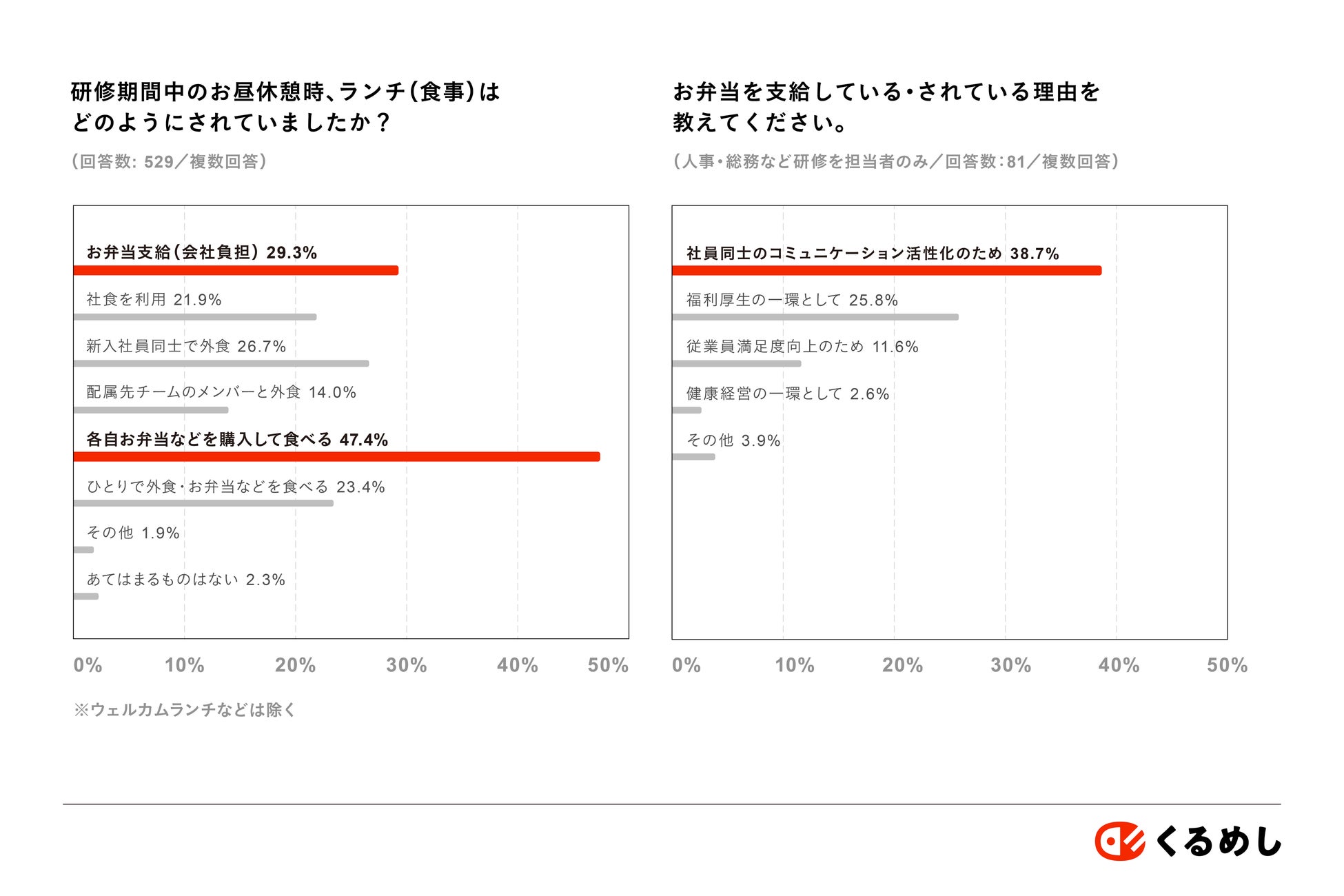 国内最大級の法人向けフードデリバリーサービス「くるめし弁当」を運営する株式会社くるめし(本社:東京都渋谷区、代表取締役:小林 篤昌)は、運営サービス「くるめし弁当」「シェフコレ」の会員向けに「新入社員研修および社内コミュニケーションに関する調査」を行いました。その中から、新入社員研修や研修期間中の食事事情、入社したての頃の悩みなどに関する調査結果をお知らせします。
