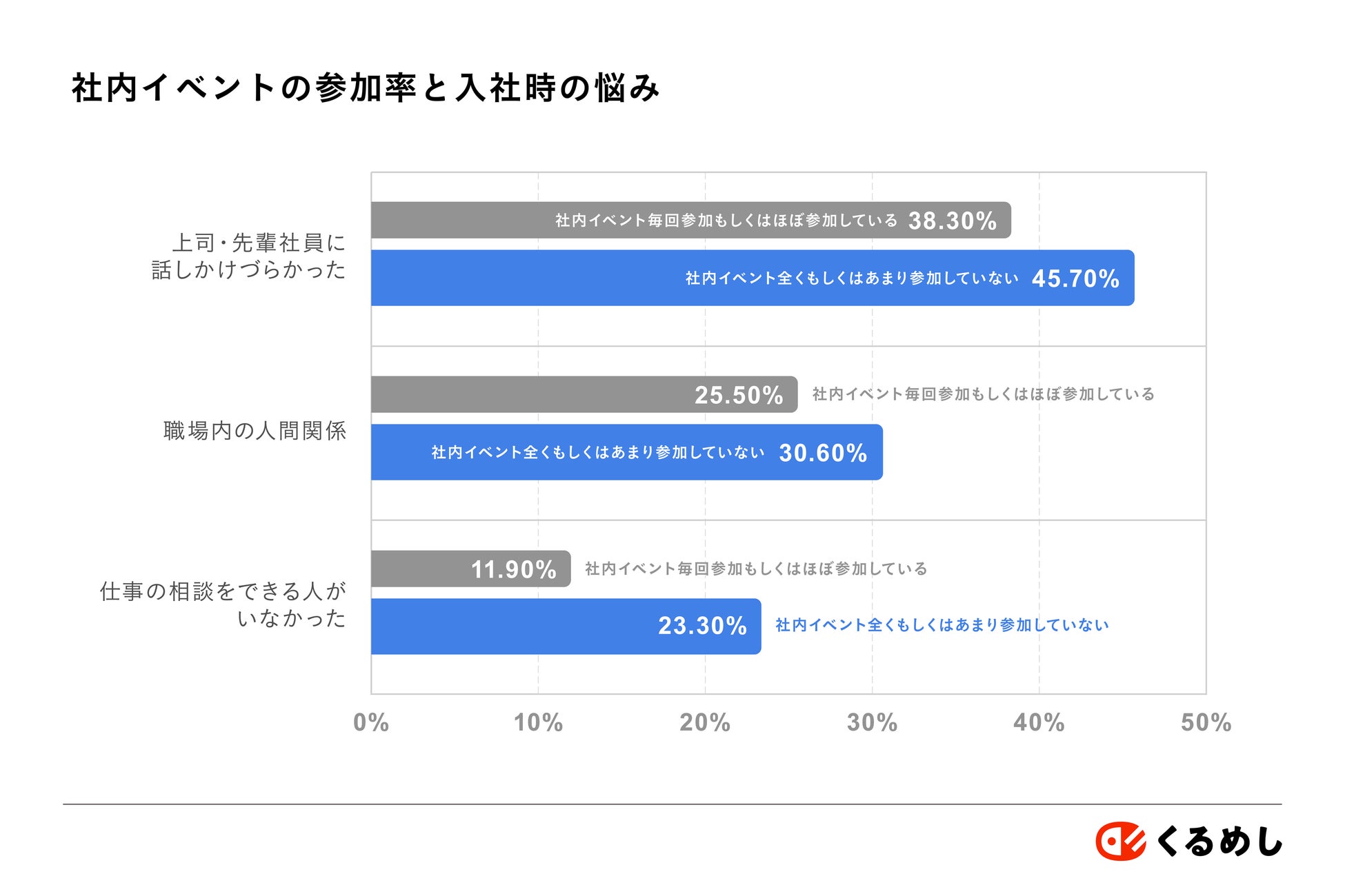 社内イベントへの参加有無と、入社したての頃の悩みの関係をみると、イベントに全く、もしくはあまり参加していない人は、毎回参加、もしくはほぼ参加している人と比較し「上司・先輩社員に話しかけづらかった」と感じたり、「職場内の人間関係」に悩みを感じている人が多い傾向にあることがわかりました。