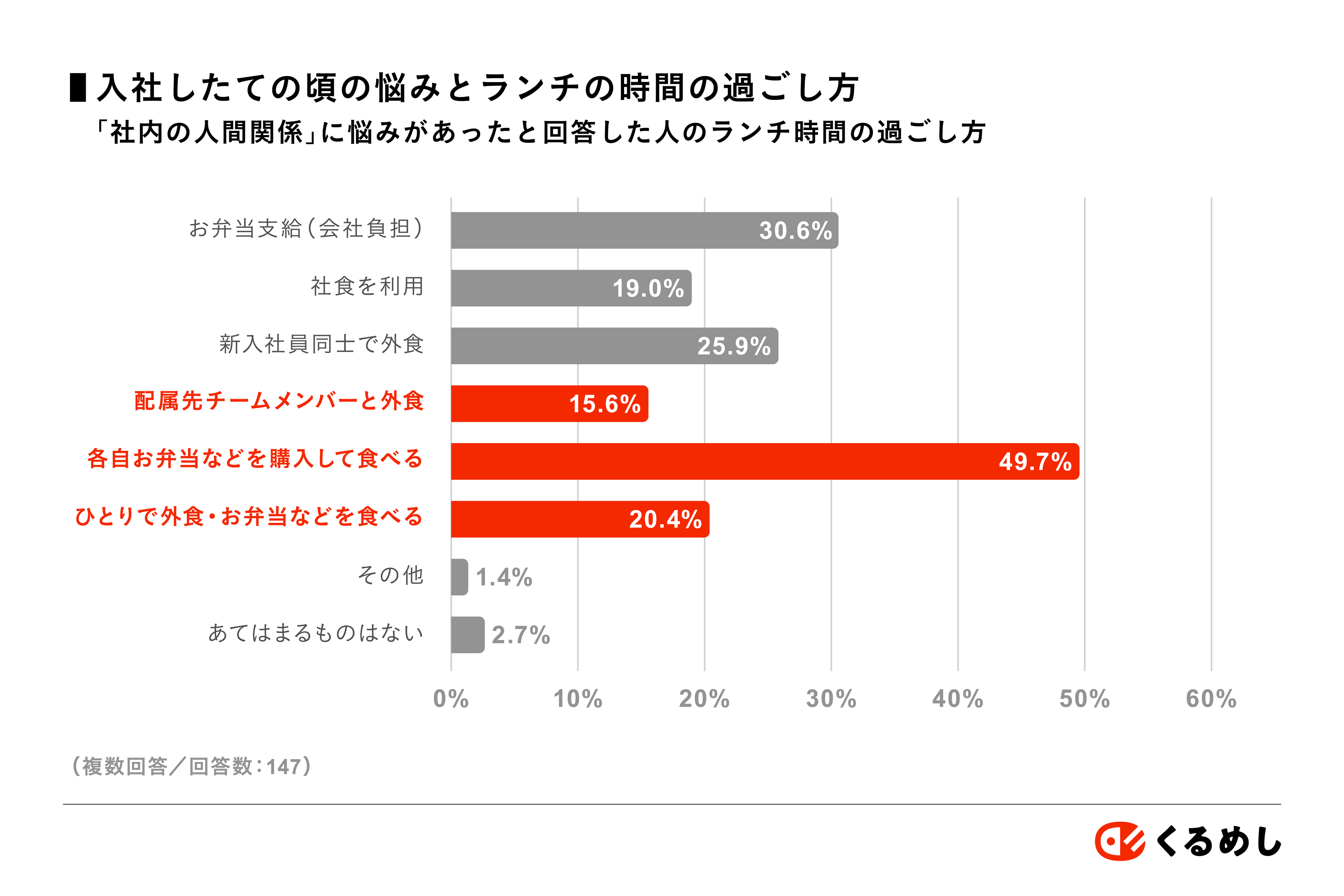 また、「社内の人間関係」に悩みがあった方のランチの過ごし方としては、「各自お弁当などを購入して食べる(49.7%)」「ひとりで外食・お弁当などを食べる(20.4%)」であるのに対し、「配属先チームメンバーと外食」していた人はわずか15.6%だったことがわかりました。