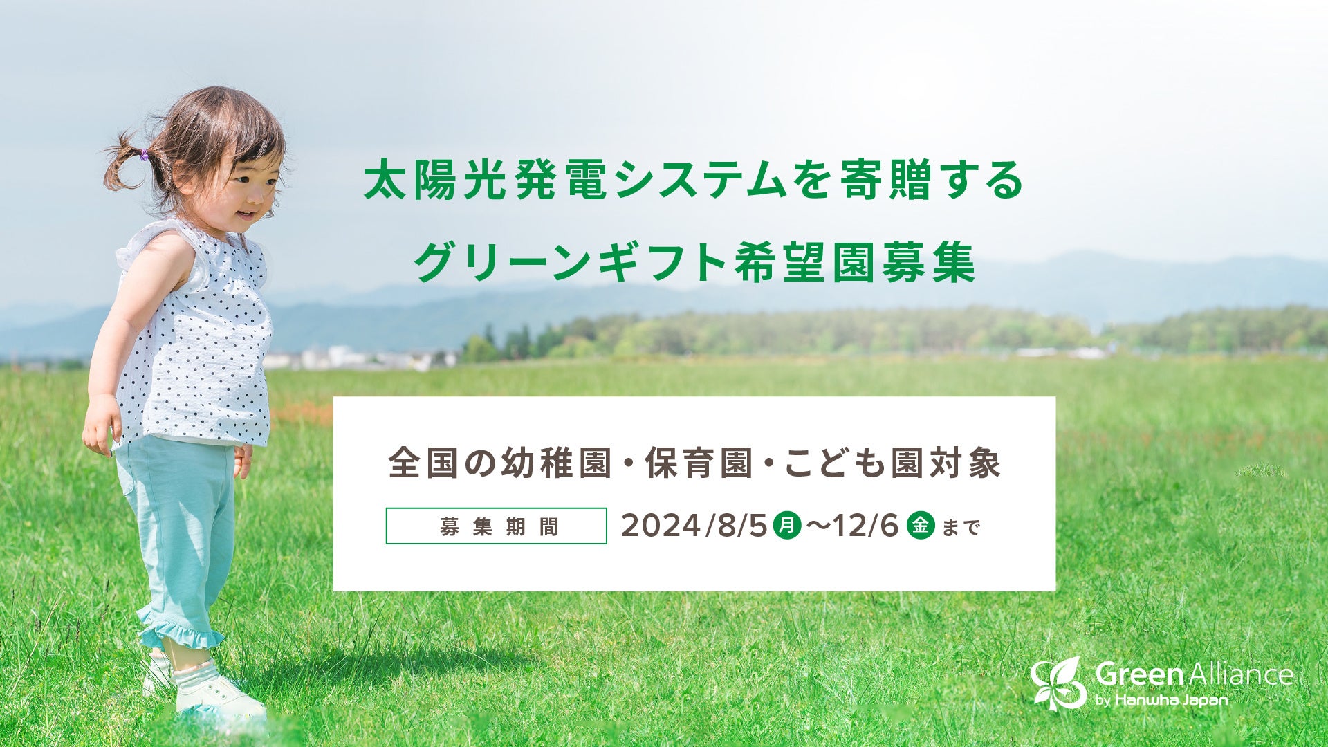 ハンファジャパン株式会社(所在地:東京都港区 代表取締役:尹 柱 以下、ハンファジャパン)は、SDGsパートナーシップ制度「Green Alliance(グリーンアライアンス)」の活動において、地域社会の発展と持続可能な社会の実現を目指し、太陽光発電システムの無償設置プロジェクト「グリーンギフト」を展開しています。このたび、本プロジェクトは全国の幼稚園・保育園・こども園を対象に、2024年8月5日(月)~2024年12月6日(金)の期間で太陽光発電システムの寄贈先を募集することをお知らせいたします。