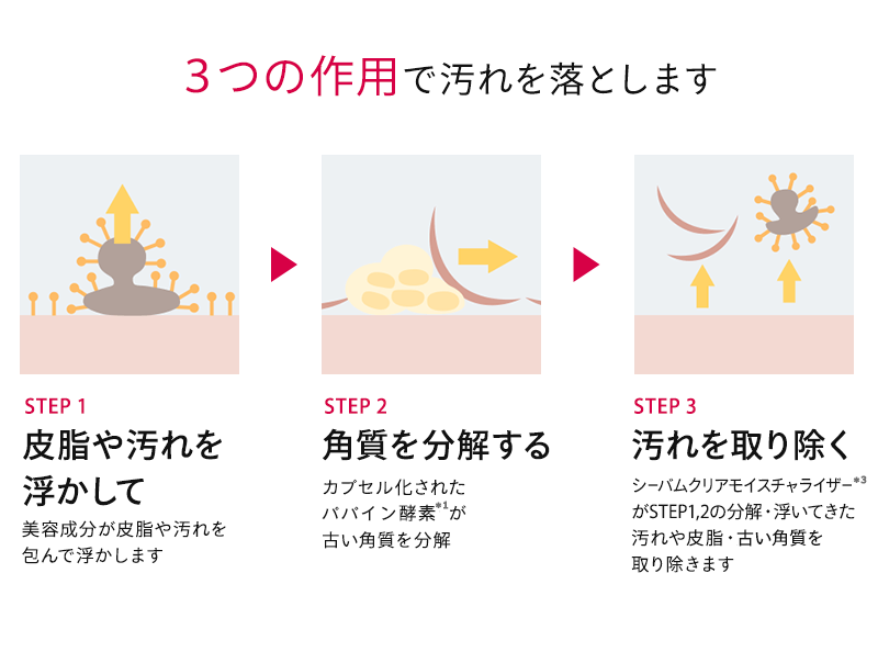 ② 「カプセル化パパイン酵素」* 配合で、不要な角質やくすみもスッキリ