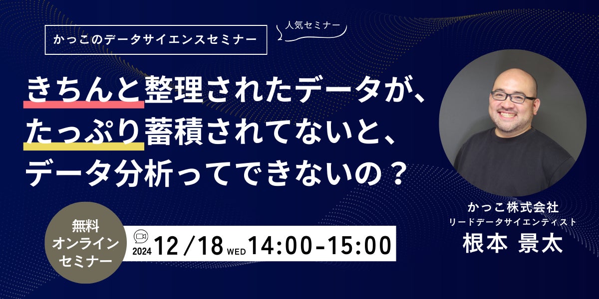 AI・統計学・数理最適化といったデータサイエンスの技術とノウハウをもとに、不正検知をはじめとしたクラウドサービスを提供するかっこ株式会社(本社:東京都港区、代表取締役社長:岩井 裕之、証券コード:4166、以下 Cacco)は、これまでにさまざまな業種の企業に対してデータ分析支援を行い、成果を上げてきました。こうした実績を背景に、事業者の皆様がデータ活用や分析を始める第一歩を学べるセミナー「きちんと整理されたデータが、たっぷり蓄積されてないと、データ分析ってできないの?」を2024年12月18日(水)にオンラインで開催することをお知らせいたします。