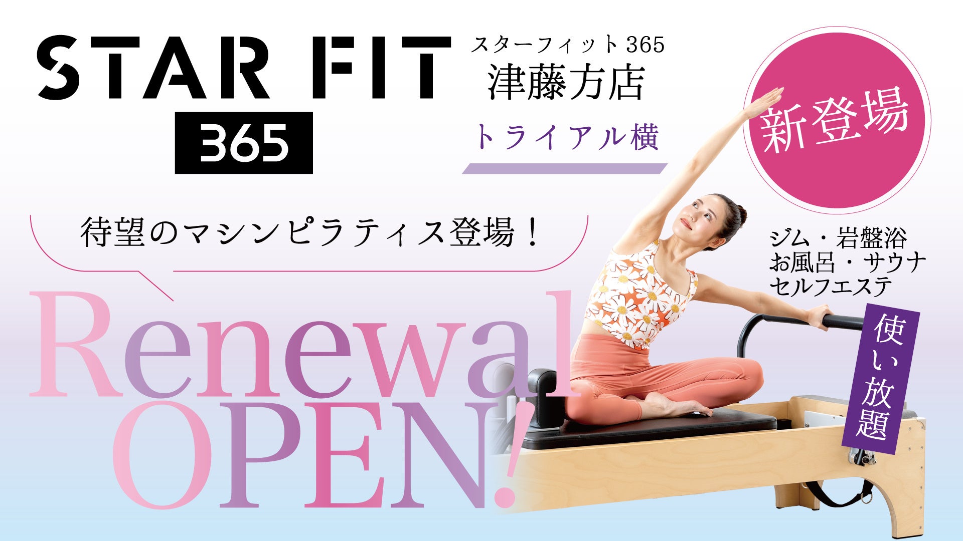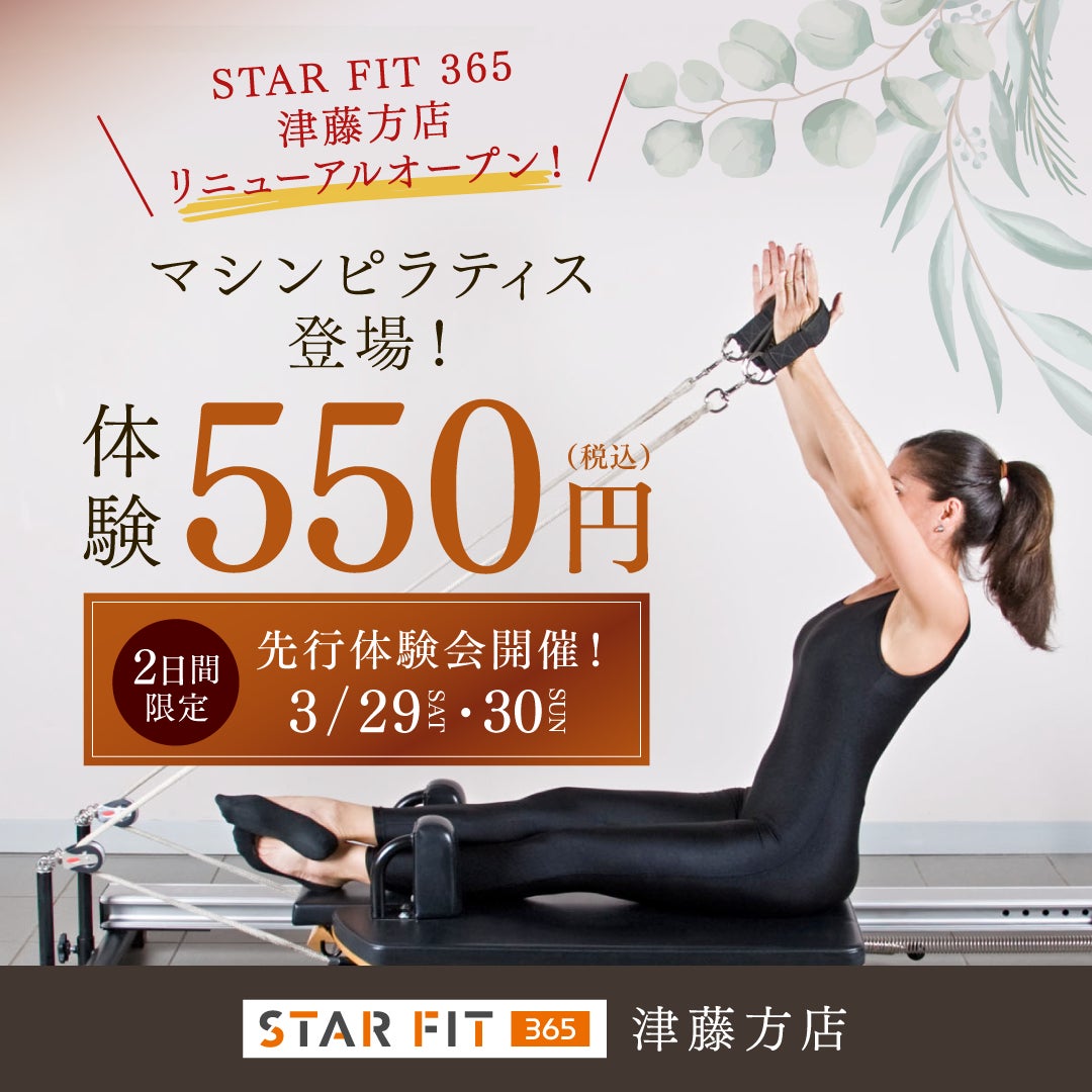 リニューアルを記念して 3月29日(土)・30日(日)にマシンピラティス体験会を開催いたします。ぜひこの機会に、新しく生まれ変わった「スターフィット365 津藤方店」をご体験ください。