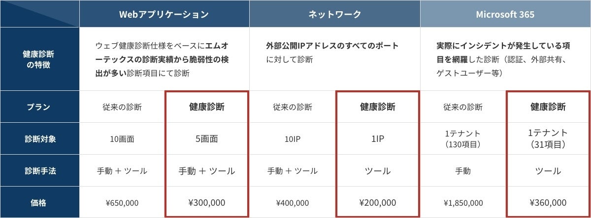 本パッケージでは、「Webアプリケーション健康診断」「ネットワーク健康診断」「Microsoft 365健康診断」の3種をご用意しております。なお、各診断では対象の診断・調査から報告書作成まで費用内で実施します。