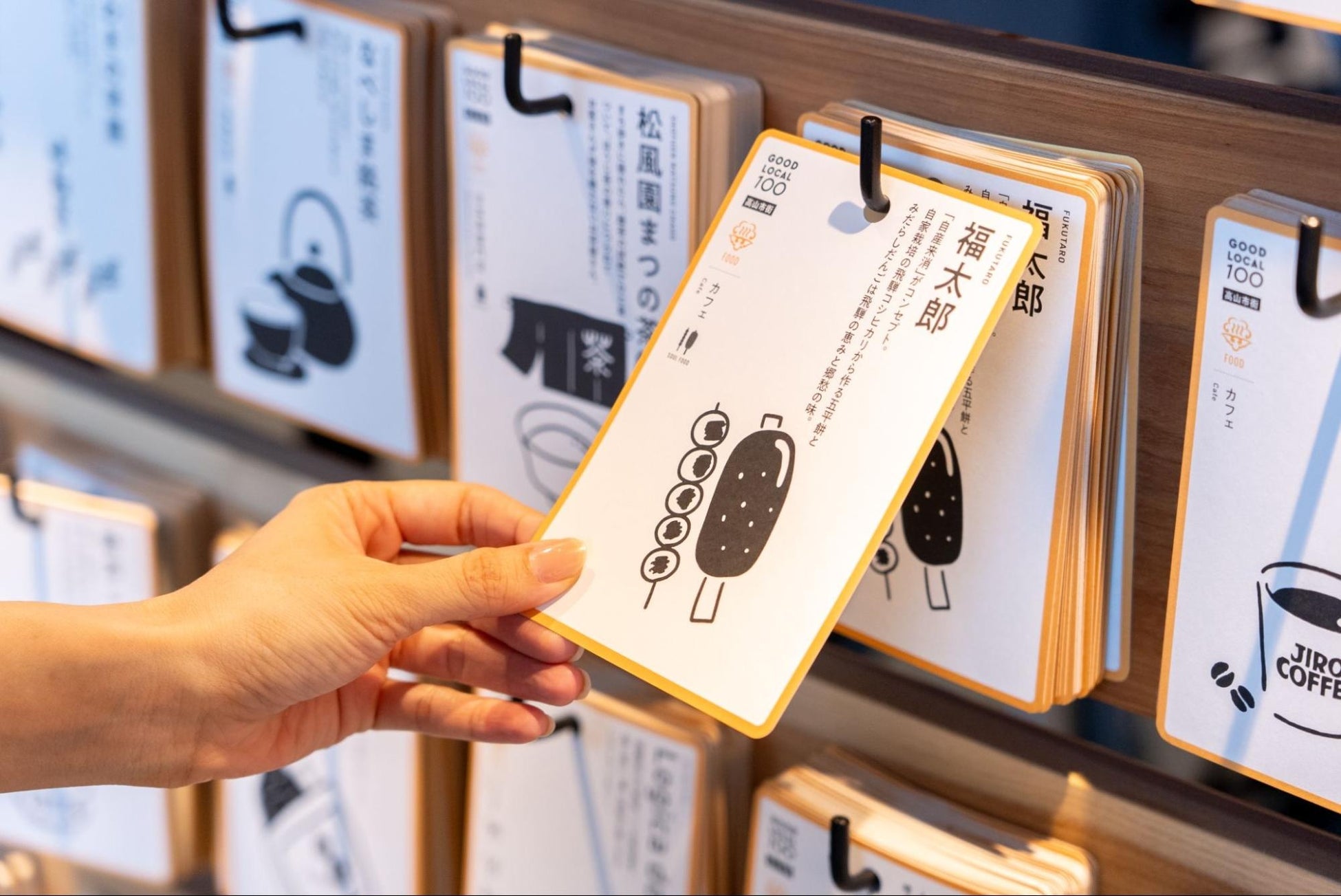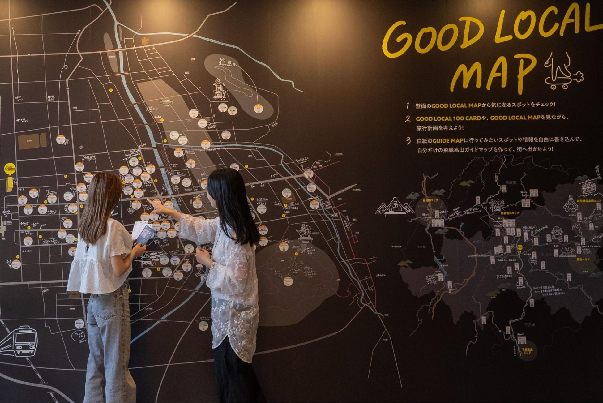 「hotel around TAKAYAMA」は飛騨高山のローカルな情報を発信する拠点としての役割を担っています。エントランス近くの壁には、飛騨高山の「GOOD LOCAL」なスポットの紹介が書かれた「GOOD LOCAL 100」というカードがたくさん並んでいます。