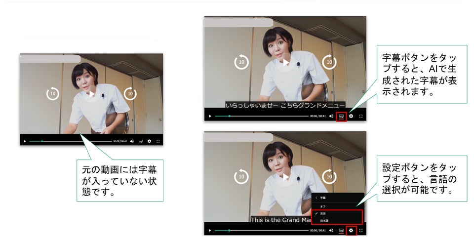 なお、翻訳せずに日本語の字幕を付加することも可能であり、音声を再生するのが難しいシーンなどでも活用していただけます。