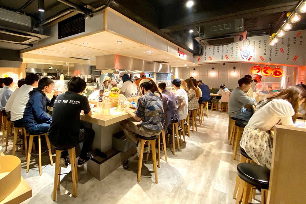 左:開店イベントで賑わう渋谷店の様子。右:10000本の串で作ったイベントオブジェ(2021年6月撮影)