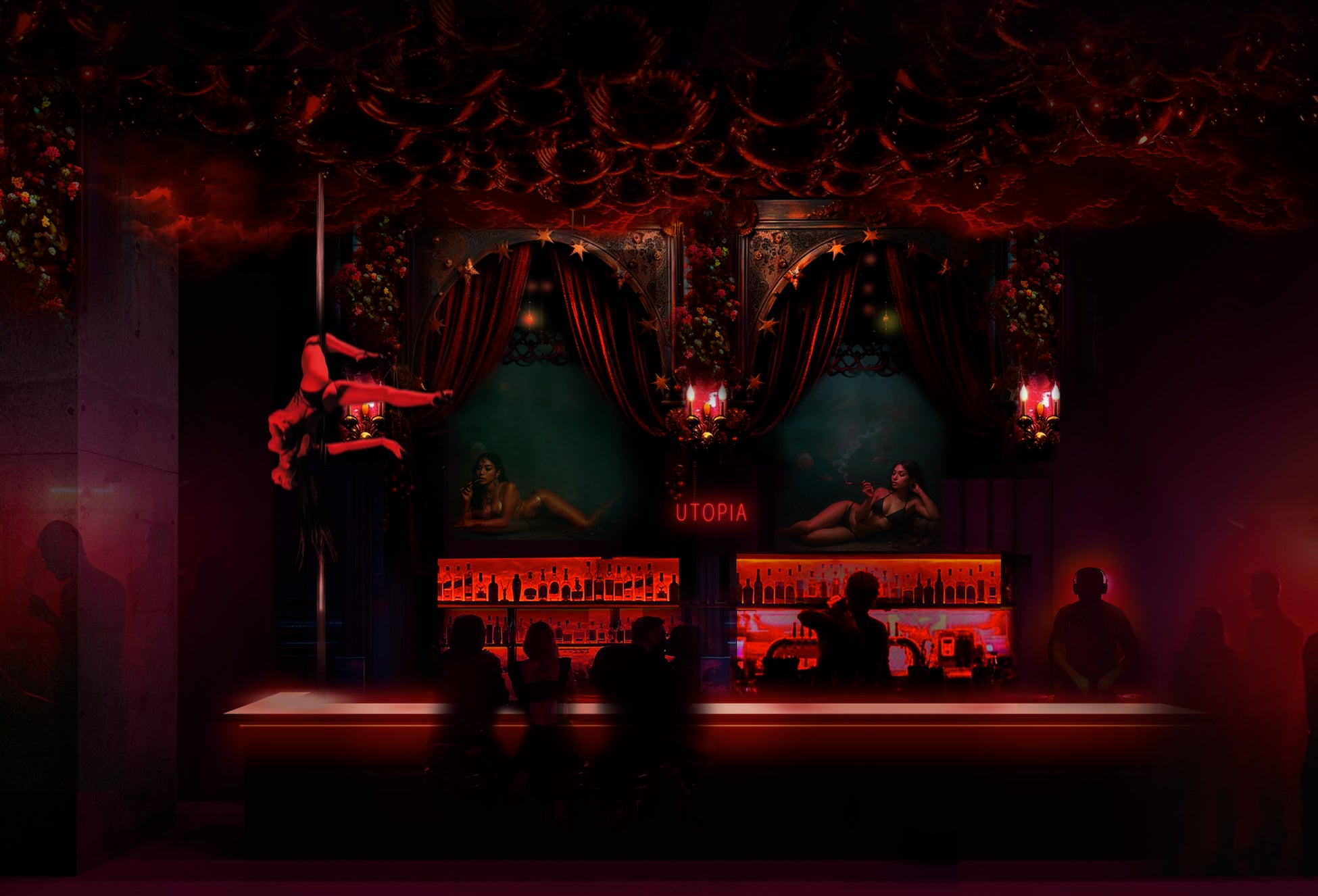 地下一階は深紅のライティングとアートの包まれたバースペース「UTOPIA」。