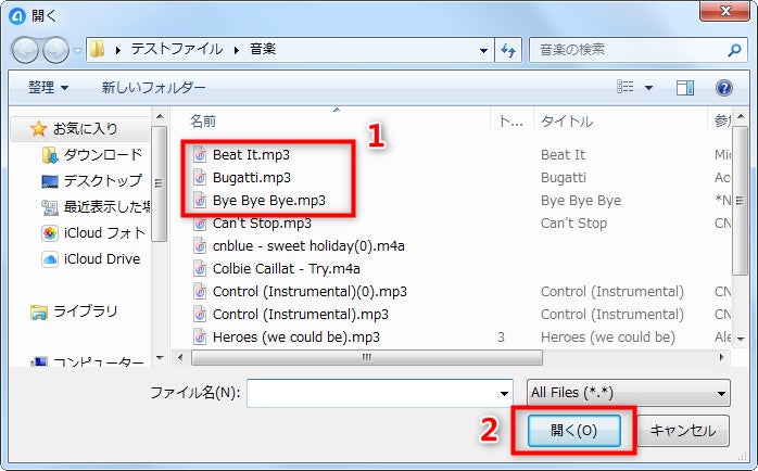 Step 4、パソコンのフォルダからiPhoneに入れたい曲を選択して、「開く」をクリックします。