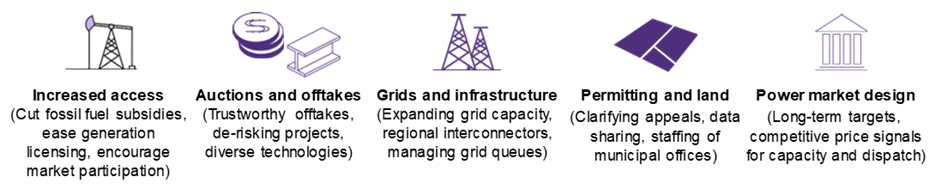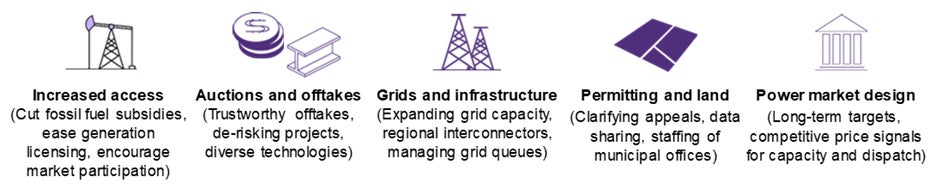 必要な取り組みを進めるためには、COP28での公約案を基に、再生可能エネルギー開発業者が直面するアクセスの障壁を取り除いたり、入札競争を可能にしたり、企業の電力購入契約を奨励したりすることが求められます。各国政府はまた、電力系統に投資し、プロジェクトの許認可手続きを簡素化するほか、新規の発電を活用できる柔軟な電力システムが奨励される電力市場・アンシラリーサービス市場の機能を確保する必要があります。