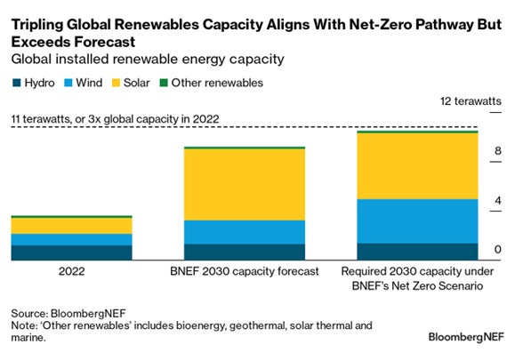 【ロンドン、2023年11月21日】-世界の指導者たちは、2030年までに世界の再生可能エネルギー導入容量を3倍にすべく、機運を高めています。これは2030年までに再生可能エネルギーの発電容量を11テラワット増加することに相当します。この目標は、今月アラブ首長国連邦で開催される国連気候変動枠組条約締約国会議(COP28)において、議長国が国際的な合意を目指す中で注目を集めるでしょう。ブルームバーグNEF(BNEF)が本日発表した分析に基づくと、当公約案は2050年までに全世界でネットゼロを実現するための軌道、そしてパリ協定の各種目標の達成に欠かせない取り組みと一致しています。