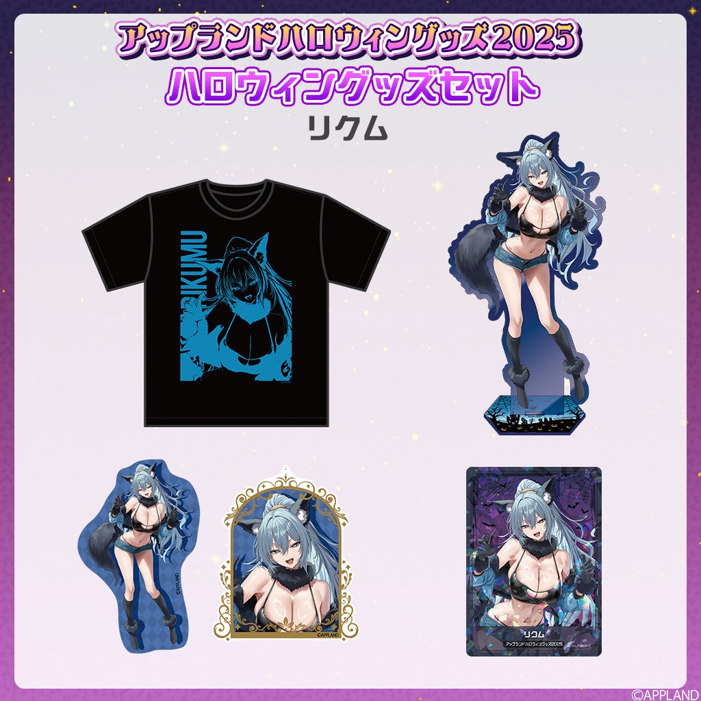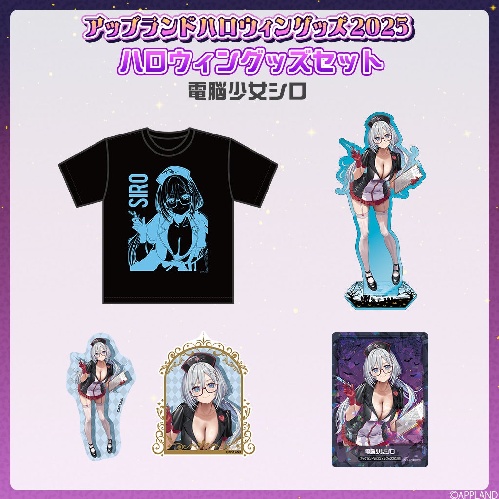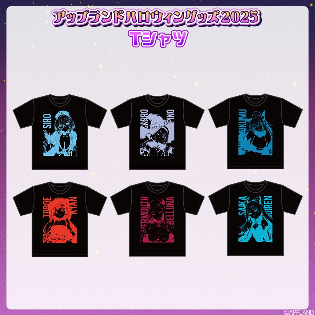 「.LIVE」より電脳少女シロ、カルロ・ピノ、リクム、「ぶいぱい」より遠吠きゃん、ベルモット・ベルーナ、彩歌すいれんの描き下ろしイラストを使用した『アップランドハロウィングッズ2025』を当社が運営する公式グッズ販売サイト(APPLAND OFFICIAL SHOP)にて2025年10月20日(月)より販売いたします。ハロウィンの妖艶な雰囲気をまとった特別なイラストグッズをご堪能ください。