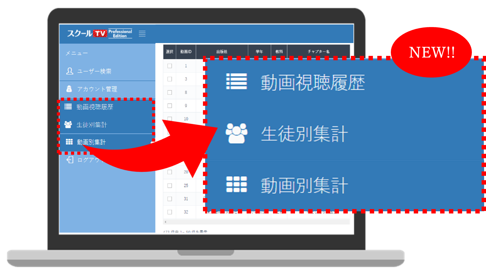 この度、管理画面に、学年・クラス単位で一括して確認できる「動画視聴履歴」、生徒一人ひとりの学習状況を確認できる「生徒別集計」、各動画の学習状況を確認できる「動画別集計」の3つの新機能が加わりました。今回の追加により、これまで以上に細分化した学習管理ができるため、学年・クラス・生徒それぞれにあった学習提供が可能になります。