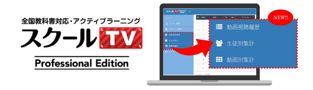 e-ラーニングに関するサービスの様々なコンテンツを提供する株式会社イー・ラーニング研究所(代表取締役:吉田智雄、本社:大阪府吹田市 以下、イー・ラーニング研究所)は、“勉強が苦手な児童・生徒も楽しみながら学習できる“というコンセプトのもと、学校・学習塾などを対象とした小・中学生向け動画教育サービス「スクールTV Professional Edition」を配信しております。この度、本サービスにて学年やクラスごと、生徒ごと、動画ごとの学習状況が分かりやすく確認できる新機能を追加いたしました。