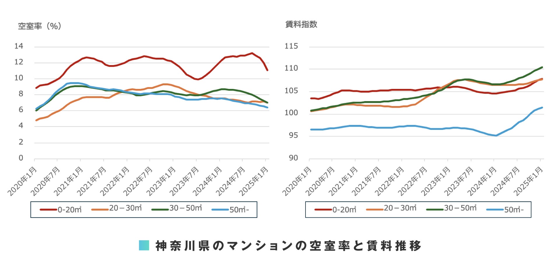 東京23区に隣接しており、通勤利便性の高い川崎市は、賃料面で東京23区居住を断念した世帯の受け皿となっています。また川崎市内にも複数の大学があります。このため、アパート、マンションのすべての面積帯の空室率が改善しています。また、支払い賃料も概ね上昇傾向にあります。一方で、東京23区への通勤・通学時間が長い地域の多い横浜市の空室率は概ね悪化傾向にあります。横浜市においては支払い賃料の上昇速度も緩やかです。