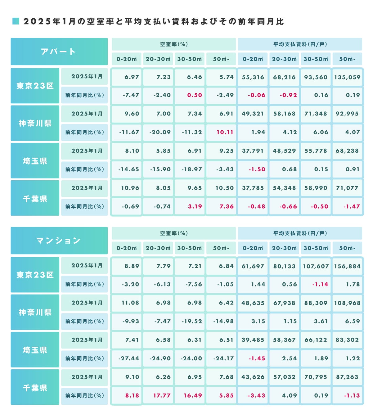 ■2025年1月の空室率と平均支払賃料および前年同月比