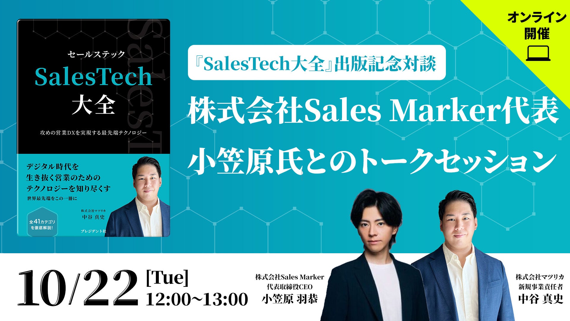 株式会社マツリカ(本社:東京都中央区、代表取締役CEO:黒佐英司)は、当社の新規事業責任者 中谷真史による初の著書『SalesTech大全』(株式会社プレジデント社 刊)の発売を記念して、2024年10月22日(火)に株式会社Sales Marker代表取締役 小笠原 羽恭氏とのトークセッションを開催いたします。