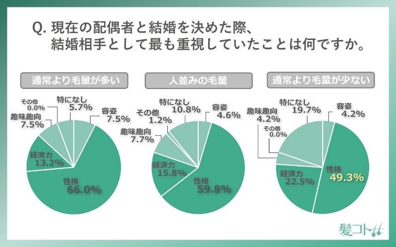 結婚相手に対して最も重視する要素として「性格」が59.6%でトップとなり、次いで「経済力」が16.2%、「容姿」と回答した方の割合は5.2%となりました。また、配偶者の結婚当時の毛量別にこちらの結果を見ると、「通常よりも毛量が少なかったと思う」という方で重要視する要素を「性格」と回答した割合は49.3%と、「人並みの毛量だったと思う」もしくは「通常よりも毛量が多かったと思う」と回答した方より割合が低くいことが分かりました。その分、「経済力」を最も重視すると回答した方の割合が高くなる傾向が見られました。