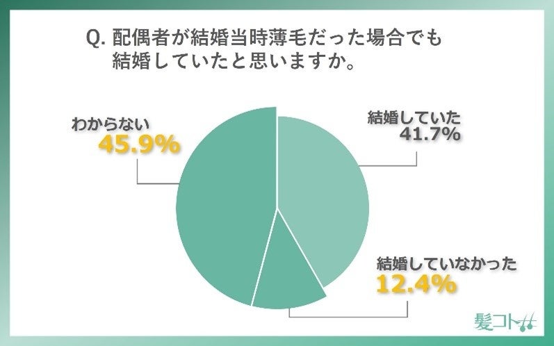 調査の結果、結婚当時の配偶者の頭髪状態について、「人並みの毛量だったと思う」もしくは「通常よりも毛量が多かったと思う」と回答した方429人のうち、もし結婚当時に配偶者が薄毛であった場合の「結婚していなかった」または「わからない」と回答した割合が約6割に上りました。