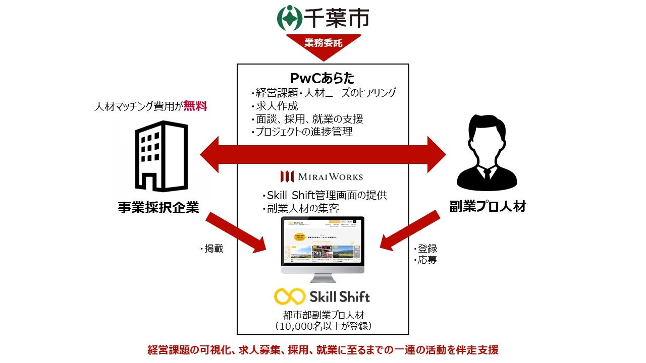 PwCあらたが各企業の経営課題や人材ニーズをヒアリングし、必要とする人材を分析した上で、経営課題を解決するための求人情報を作成し、各企業が求人情報を『Skill Shift』に掲載します。当社は、『Skill Shift』管理画面の提供と副業人材の集客を実施し、千葉市は、『Skill Shift』の利用にかかる求人掲載費用の全額を負担します。また、PwCあらたが、企業と副業・兼業プロフェッショナル人材との面談、採用、就業に至るまでの一連の活動の伴走支援、並びにプロジェクトの進捗管理を行い、プロジェクトをサポートします。