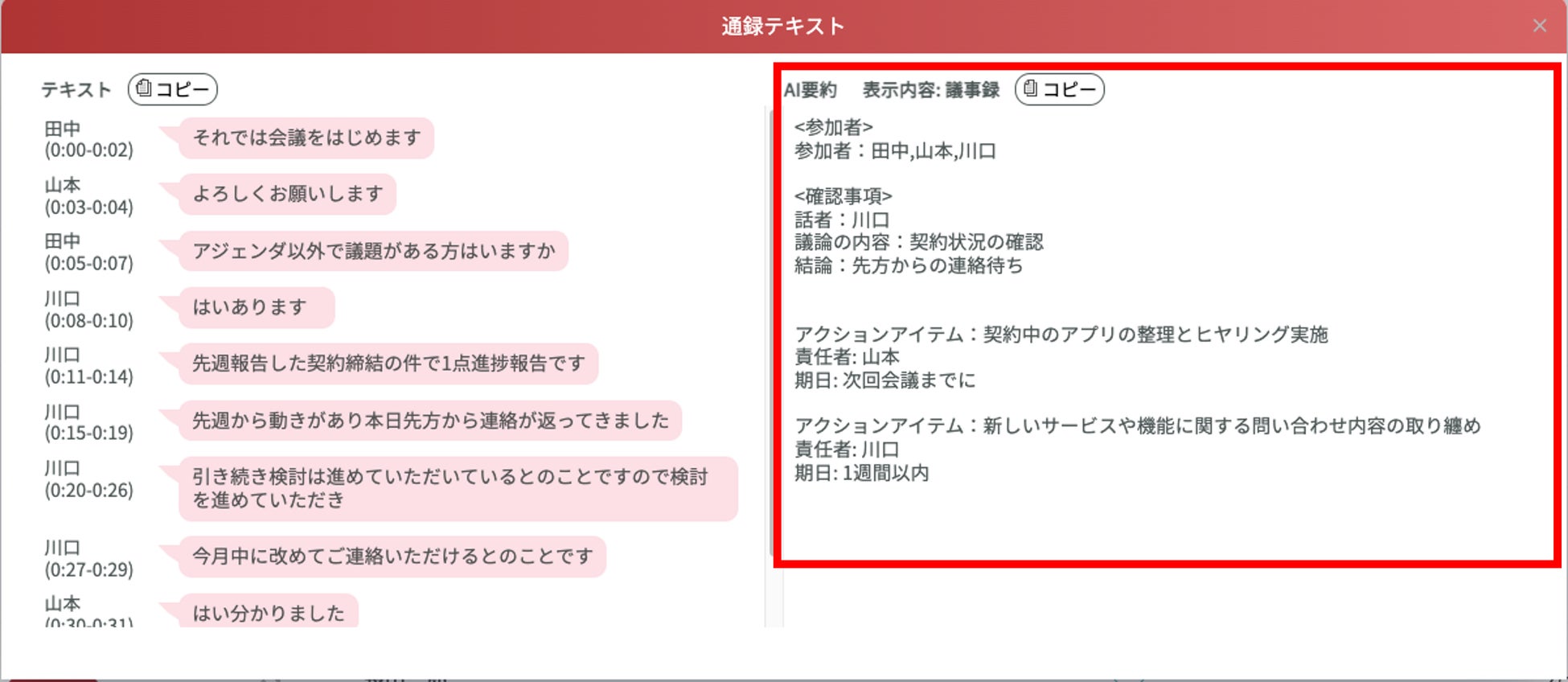 生成AIによる議事録の出力内容の検討は非常に困難でした。特に、議事録の出力形式に関してニーズを調査し、それに基づいた最適な解決策を見出すことが困難でしたが、チーム内で複数の出力形式を試行錯誤し、より良いフォーマットに見出すことができたと考えております。また、テキスト化の精度も大きな課題でしたが、シンカがすでにリリースしている「カイクラ」の電話音声のテキスト化機能を開発した時の過去の我々の経験を活かしつつ、精度向上に向けて全力で取り組みました。この実証試験(PoC)の結果をもって、さらなる開発を進め、よりご活用いただける機能としてリリースできるよう進めます。