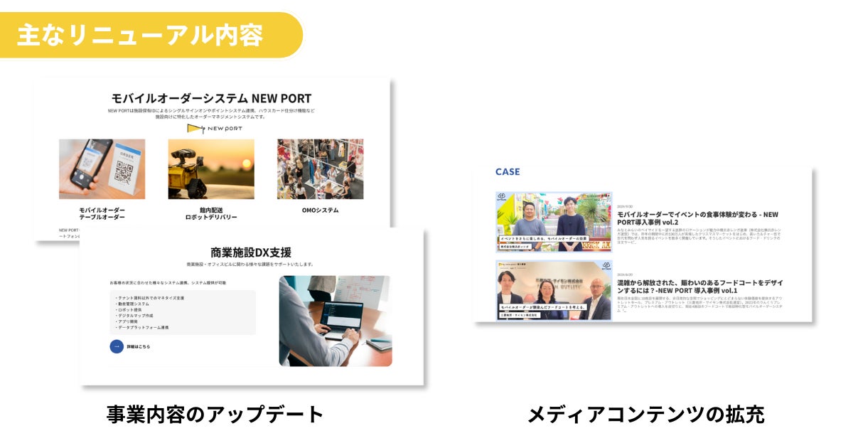 新たなサイトでは、当社が運営する施設特化型モバイルオーダーシステム「NEW PORT」に加え、商業施設向けのDX支援事業や、関連する各種サービスの詳細を追加しています。これにより、デベロッパー様や飲食事業者様をはじめとするお客様がお持ちの幅広いニーズに、当社の多様なソリューションを効果的にご紹介いたします。