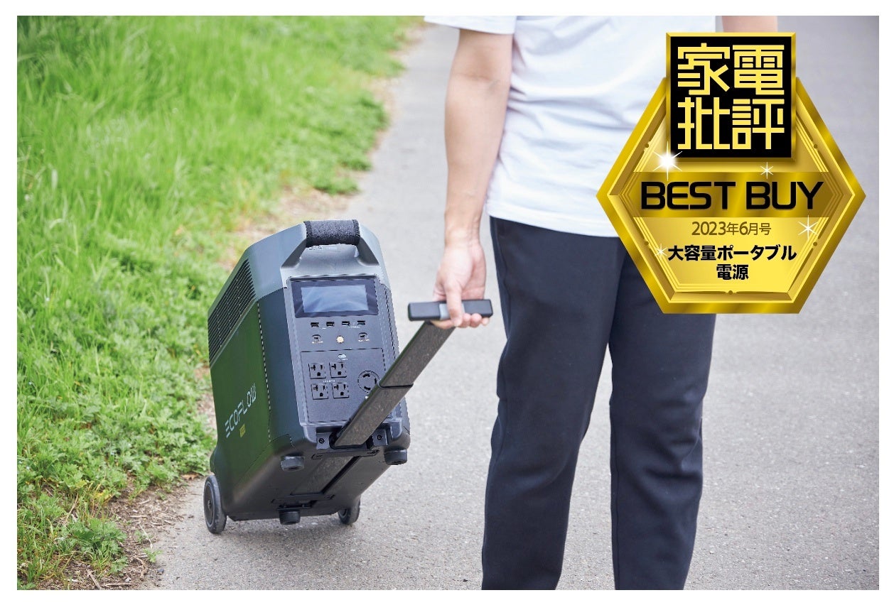 実容量率(公称値に対する実測値の%)は他製品が70%台後半〜80%台前半だったのに対し、本製品は約87%とトップの成績でした。また、3000Wh 超の容量ともなれば約45kgとかなりの重量ですが、キャスターと収納式の持ち手がついているため平らな場所ならスムーズに動かせる点も、ライバルより優れています。ポート数も多く、USB-Aの急速充電も可能です。