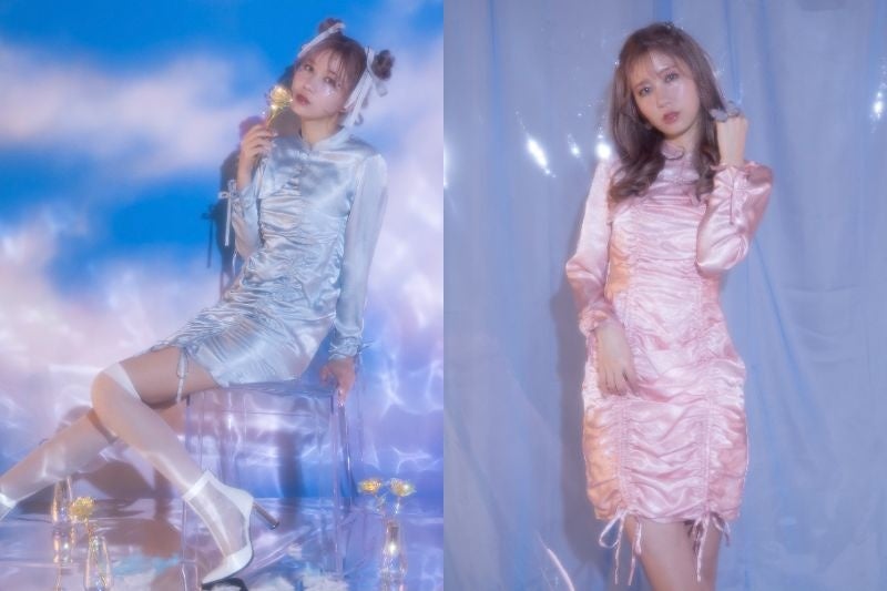 中華服をイメージしてデザインされた、サテン素材のワンピース。