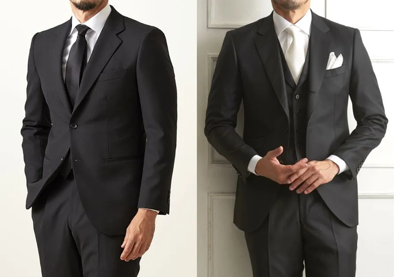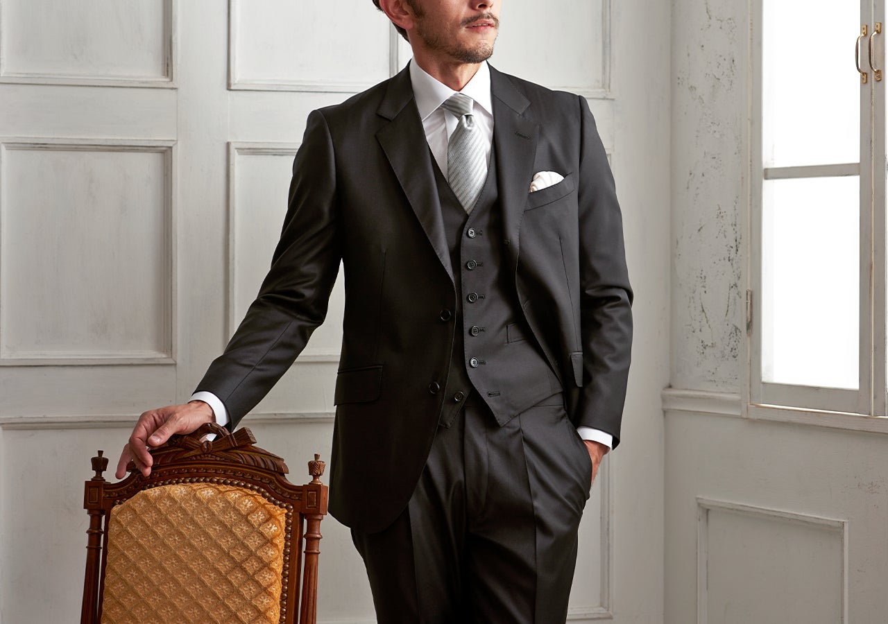 冠婚葬祭で活躍するフォーマルスーツ(礼服)は、ベスト付きでさらにフォーマルな印象に。