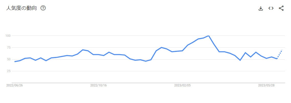 下記グラフは、2022年6月から2023年6月までの、『礼服』というキーワードをネット検索したユーザー数の推移を示した『Google トレンド』のグラフです。フォーマルスーツ(礼服・喪服)は年間を通して需要があります。