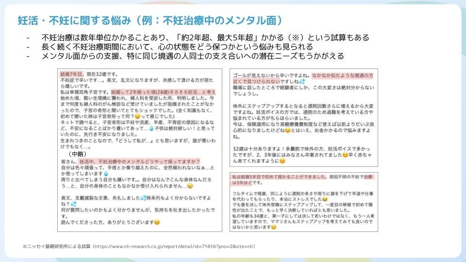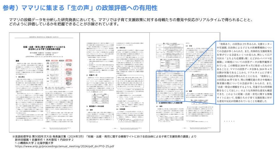 実際に、ママリの投稿データを分析した研究発表(※)において、子育て支援政策に対する母親たちの意見や反応がリアルタイムで得られること、どのように評価しているかを把握できることが示唆されています。