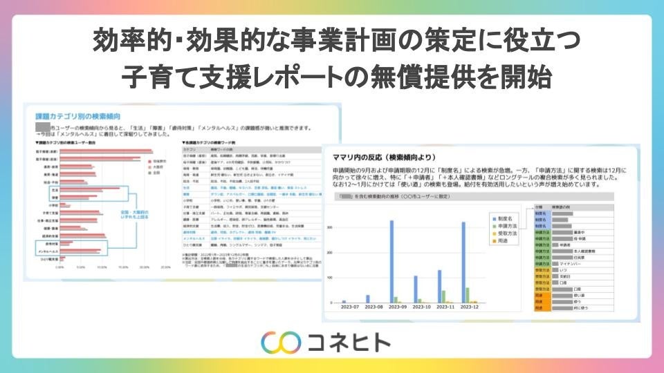 子育て支援アプリ「ママリ」を開発・運営するコネヒト株式会社(本社:東京都港区、代表取締役 杉井 信一郎、以下「コネヒト」)は、「ママリ」に蓄積された自治体ごとの住民の「生の声」を集約・分析した子育て支援レポートの提供を開始したことをお知らせします。