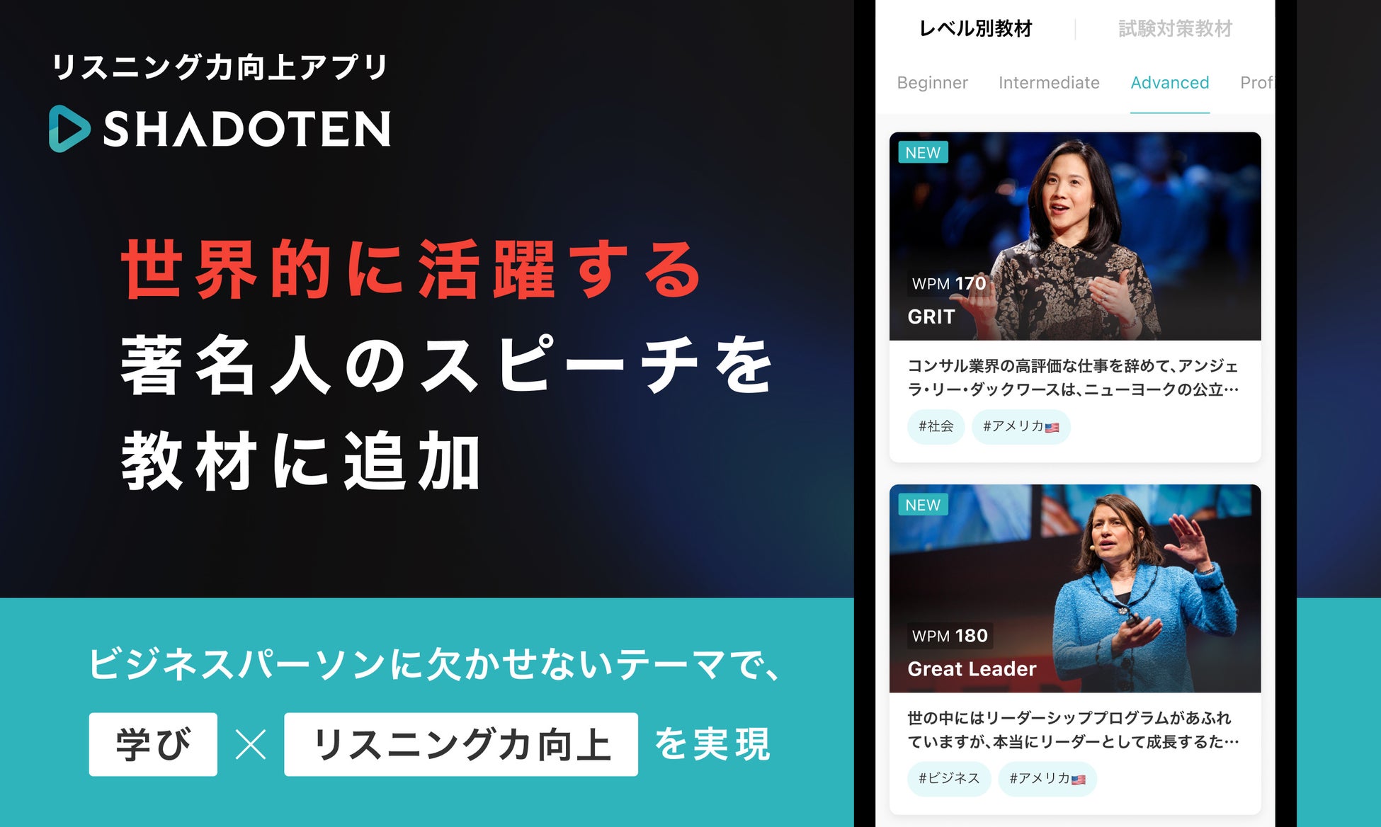 リスニング力向上アプリ「シャドテン」、世界的に活躍する著名人のスピーチを教材に追加