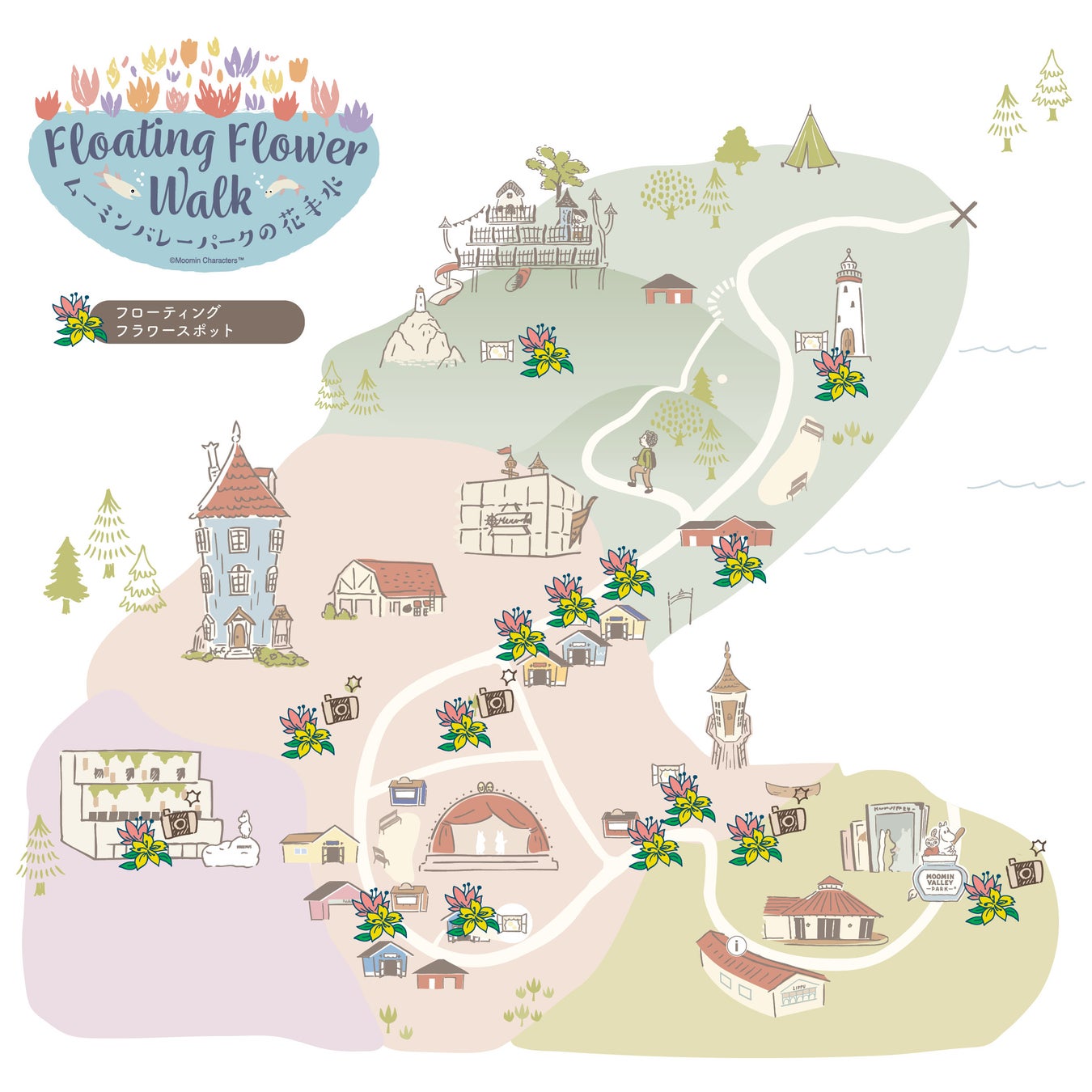 「フローティングフラワー」スポットを巡りながら、春のムーミンバレーパークの散策をお楽しみください。