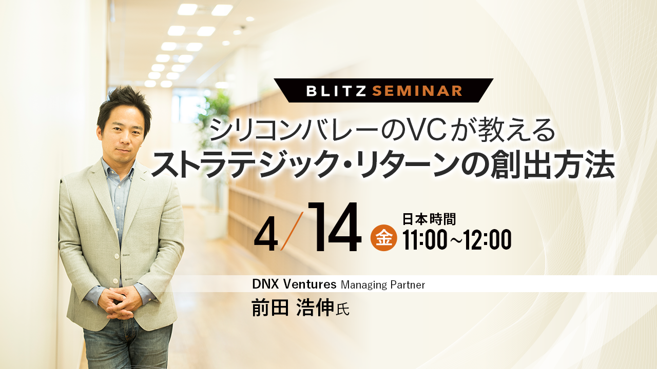 TECHBLITZ主催のオンラインセミナーシリーズ「BLITZ SEMINAR」。今回はDNX Ventures Managing Partnerの前田 浩伸 氏をお招きしてお送りします。事業会社でのCVC活動の経験を持ち10年にわたって事業会社とスタートアップの橋渡しをしてきたシリコンバレーのベンチャーキャピタリストである前田氏に、CVCとVC双方の視点から担当者の指針となるインサイトを提示いただきます。
