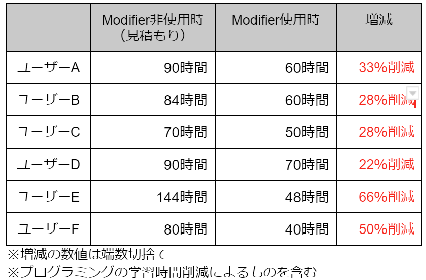 ・XRコンテンツ制作実証実験におけるModifier使用時と非使用時(従来ワークフローでの見積もり)の作業時間の変化