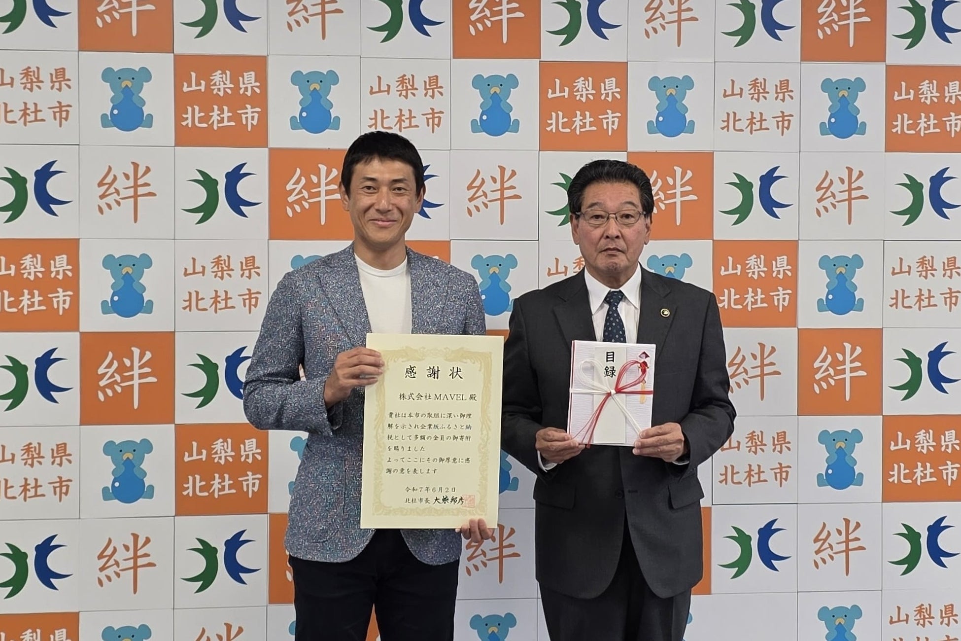 「すべてのマーケティングを成果報酬に」を掲げる株式会社Macbee Planet(本社所在地:東京都渋谷区、代表取締役社⻑:千葉 知裕)のグループ会社である株式会社MAVEL・株式会社All Ads・株式会社MacbeeXの3社は、企業版ふるさと納税を活用し、山梨県北杜市に対して寄付を実施いたしました。2025年6月2日には、同市にて北杜市長・大柴 邦彦氏による感謝状贈呈式が執り行われたことをお知らせいたします。本寄付は、北杜市が推進する「もっと世界を魅了するまちづくり事業」の一環として、同市の豊かな“水資源”を活かした次世代型農業プロジェクトに活用される予定です。今後、産学官連携によるプロジェクトの組成を通じて、地域課題解決にも貢献してまいります。