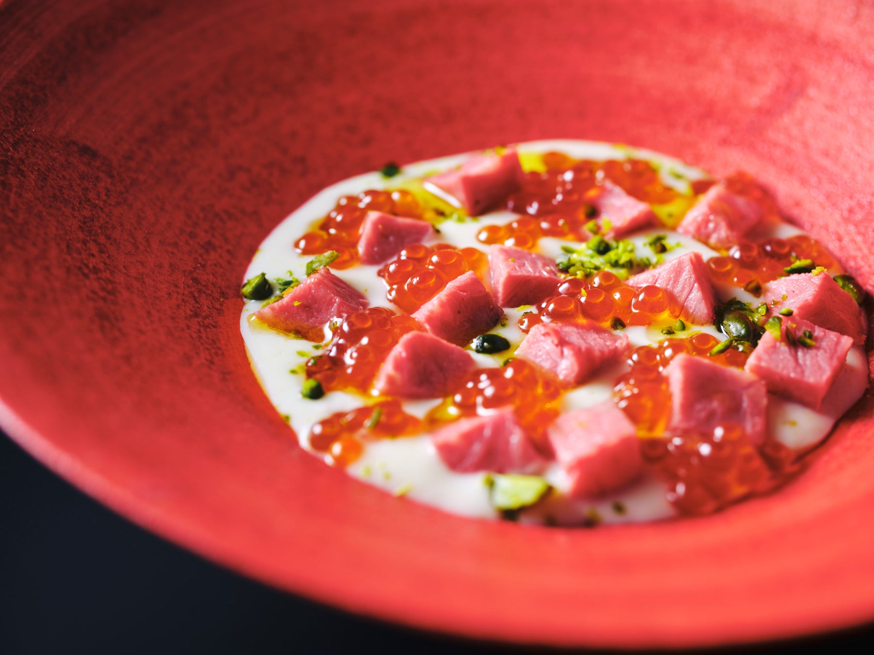 淡路島のレモンを使用して、淡路島産玉ねぎを合わせ、素材の味を最大限に生かしたピューレを作りました。しっかりと感じるレモンの酸味と玉ねぎの甘味、低温調理するからこそ残る肉感と、鱒いくらの弾ける食感を総合的にお楽しみください。