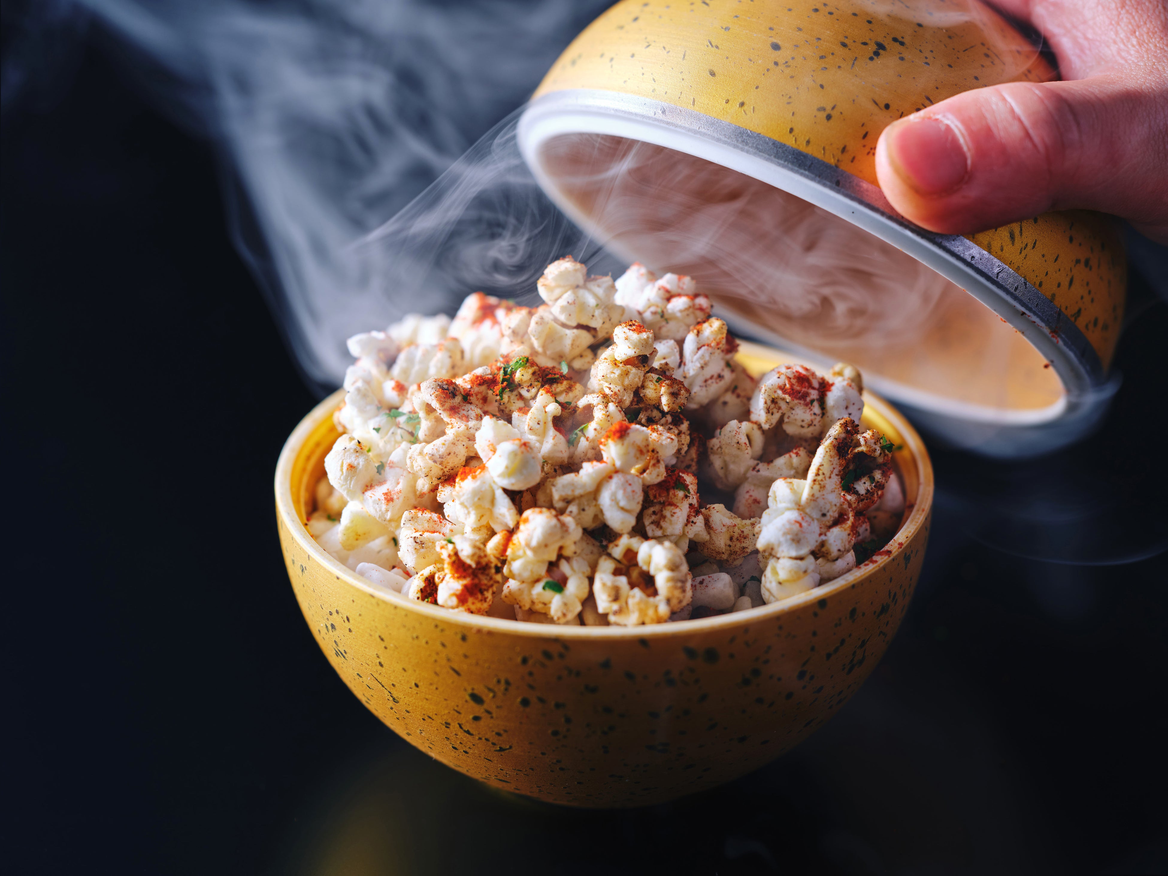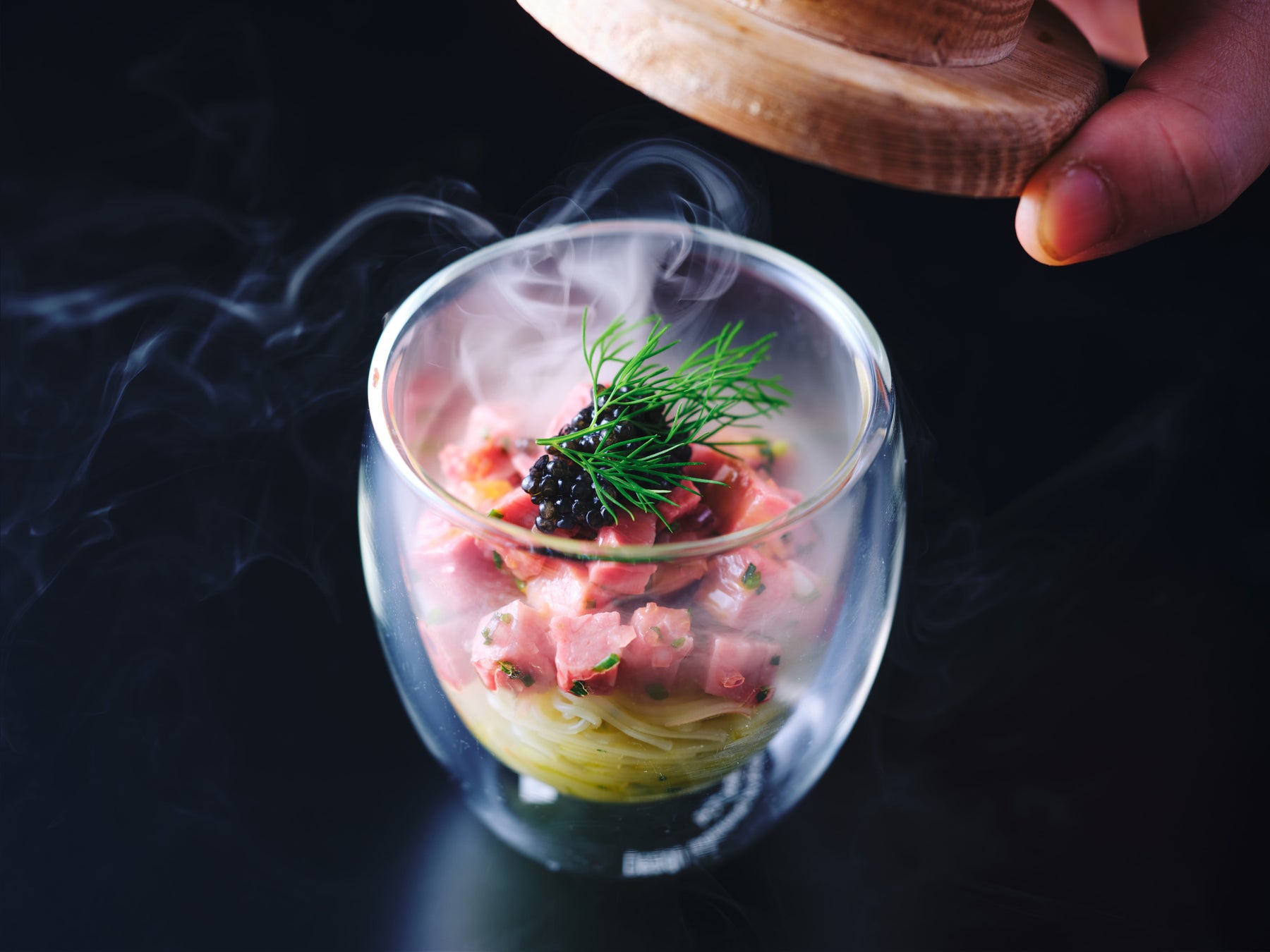 和牛のタルタルにイタリア産キャビアを合わせ、桜チップのスモークを目の前で施して仕上げるプレゼンテーションでご提供します。燻した煙が和牛に移り、スモークの味わいが一層引き立ちます。