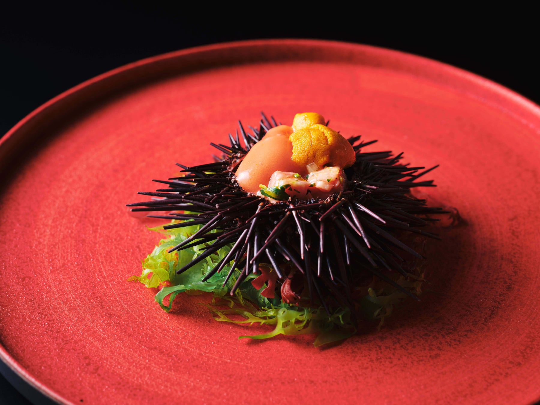 「和牛昆布締め×北海道産うに 大阪産アマメイドミニトマトのエスプーマ」