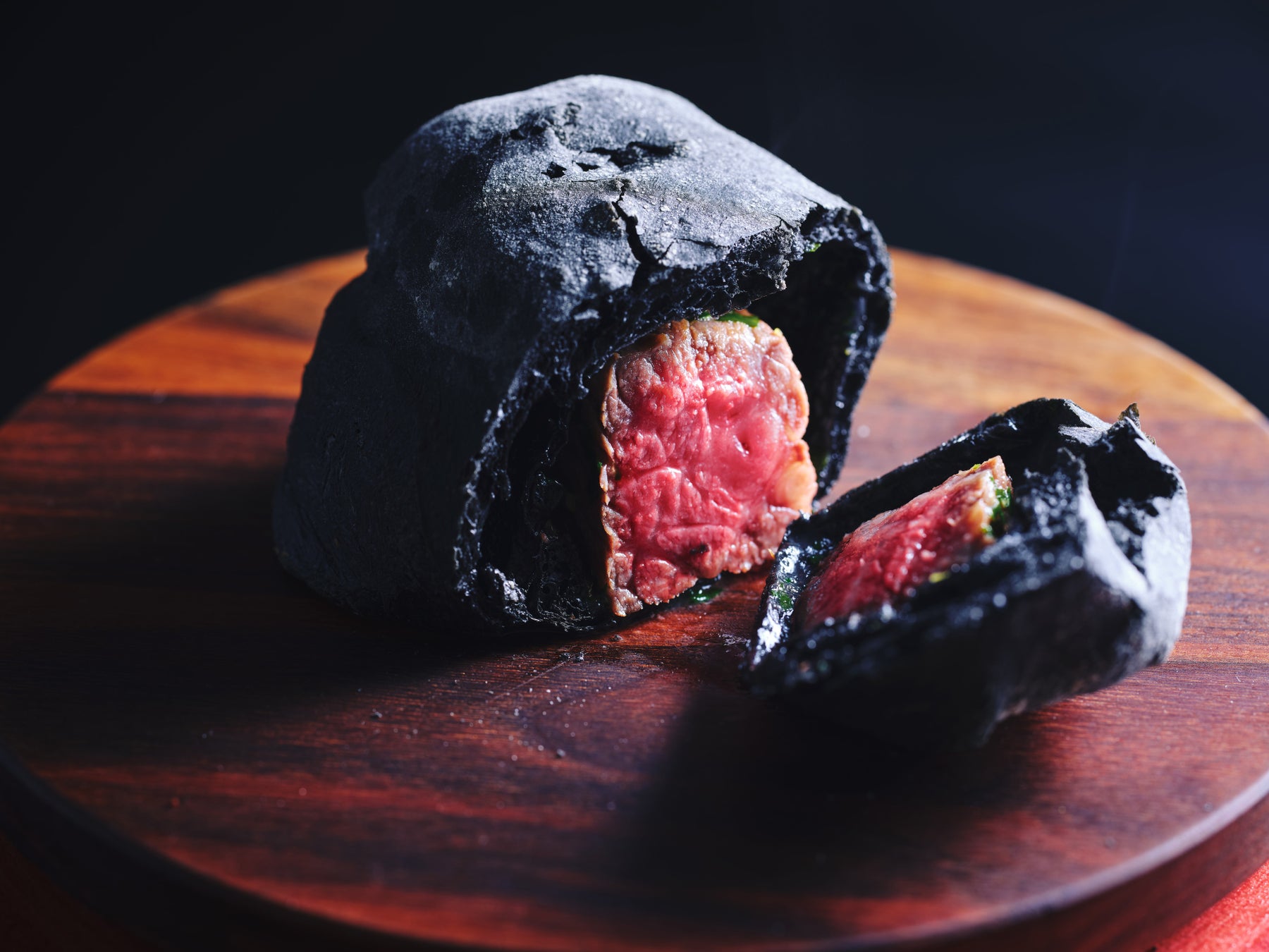 シグネチャーディッシュ「竹炭生地で包み焼きした薪焼き熟成和牛 あけがらし、赤ワインソルト、煮切り醤油」