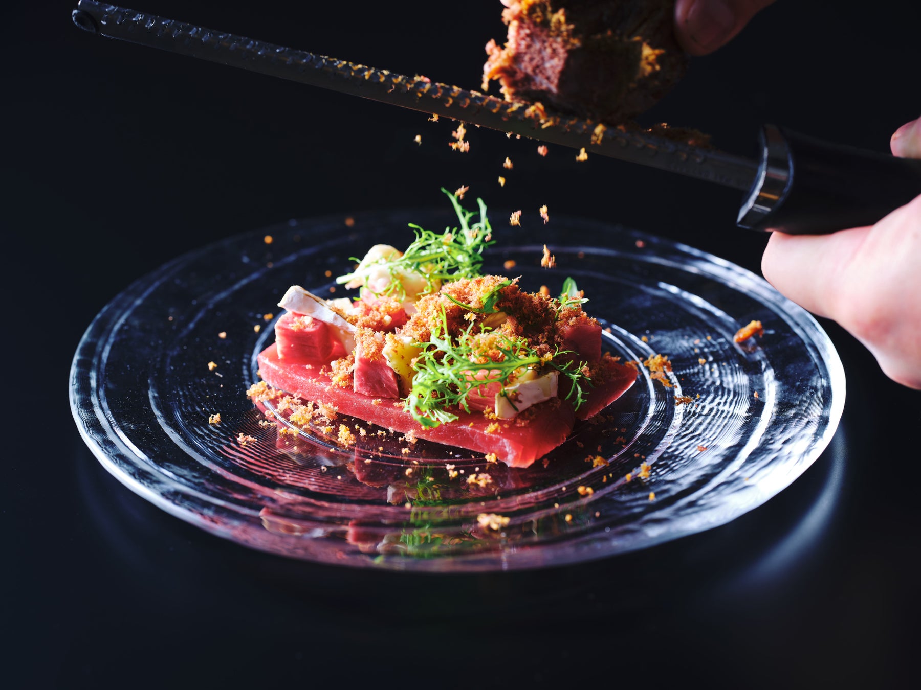和牛のタルタルとマグロのカルパッチョにカマンベールチーズをあしらいました。和牛のもも肉を約2週間かけて作る自家製の和牛の肉節を上から削って仕上げる一品。肉の旨味と本マグロ、チーズの組み合わせをご堪能ください。