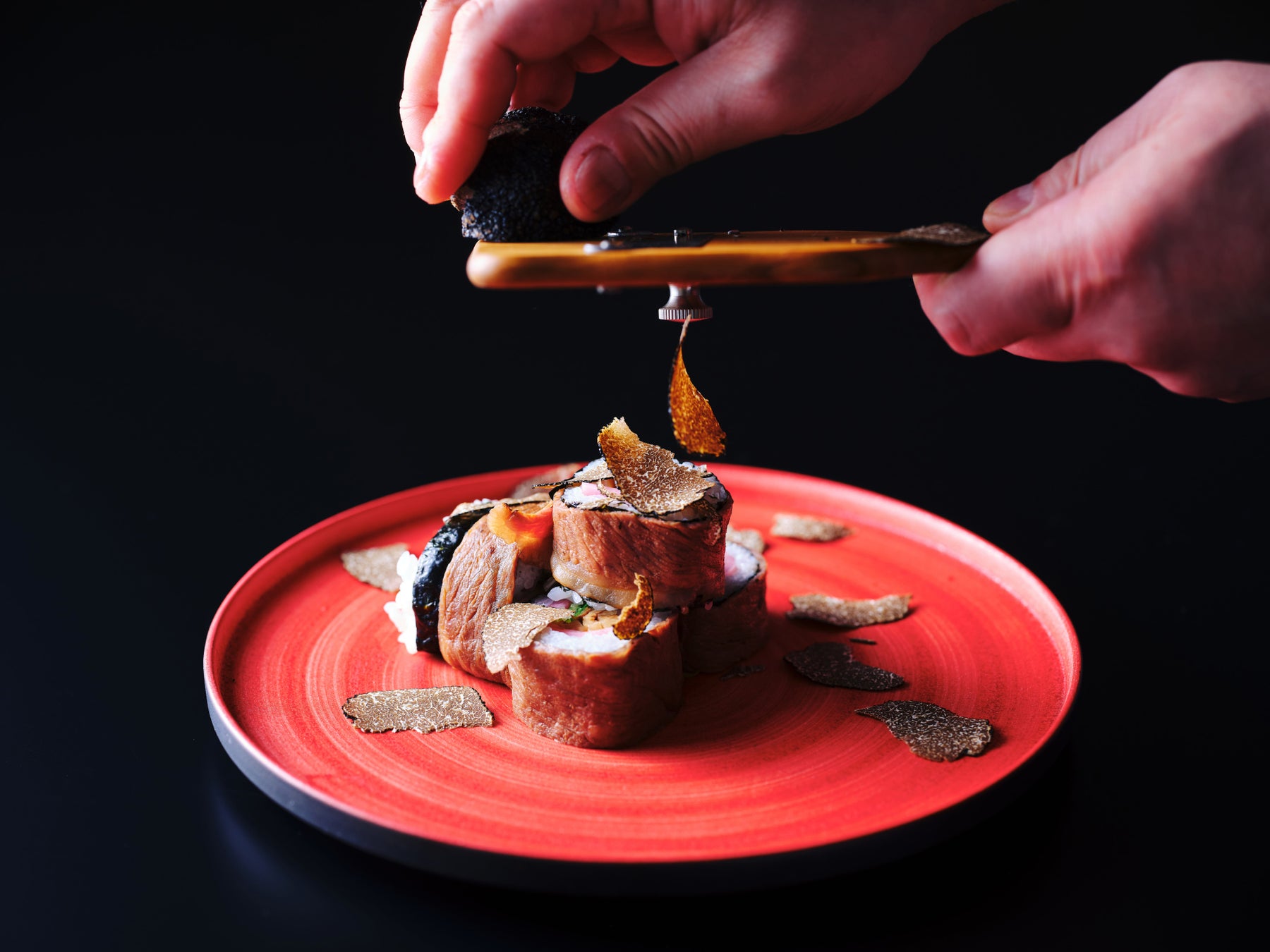 煮切り醬油で味付けして炙った和牛、海苔とご飯で、明治三十年から大阪黒門市場で続く「伊勢谷」の漬物を巻いてご提供します。肉のとろけるような味わいと、軽快な漬物の歯ごたえが口に広がる絶品。削りたてのトリュフの香りが味を一層引き立てます。