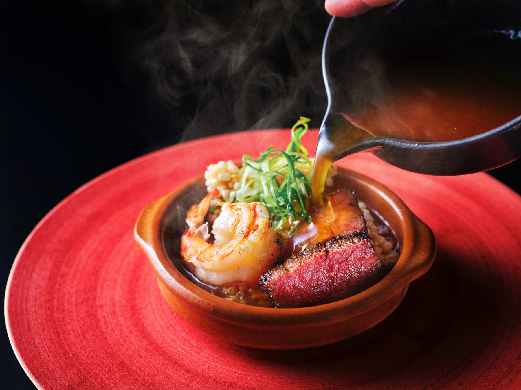 香ばしく薪焼きした和牛と海老、おこげに、熱した自家製ビーフコンソメをかけていただく一品です。おこげが弾ける様子を、五感で堪能していただけます。まるで中国料理を思わせる、シェフの遊び心あふれる一品。