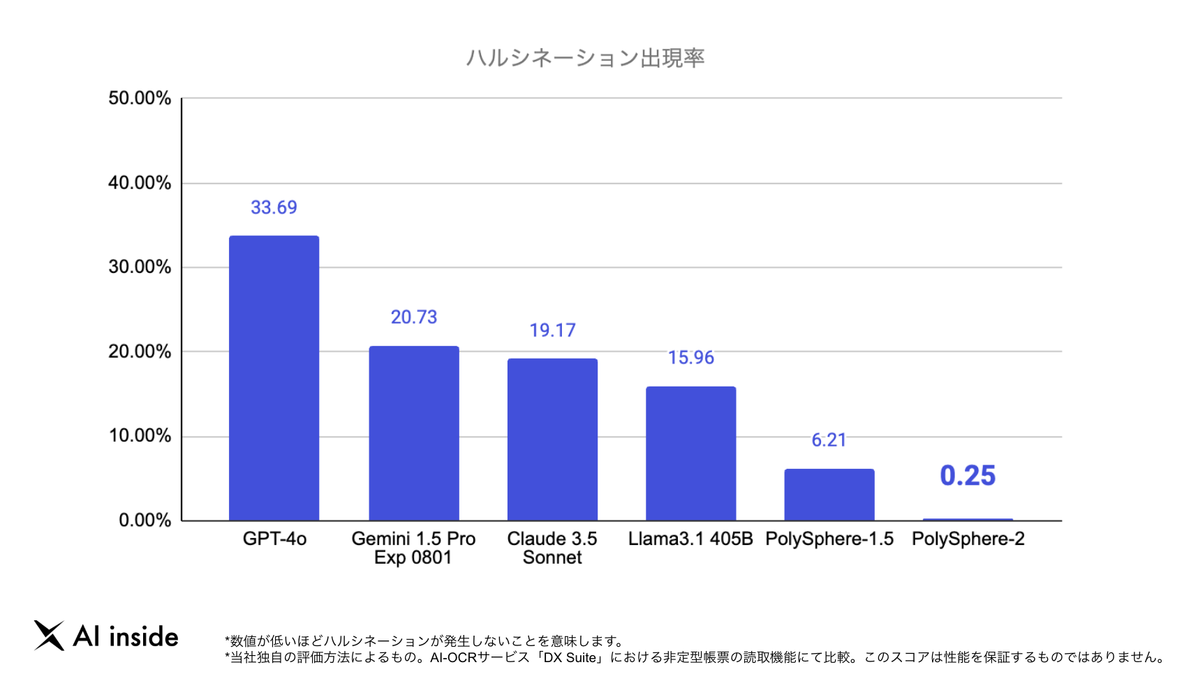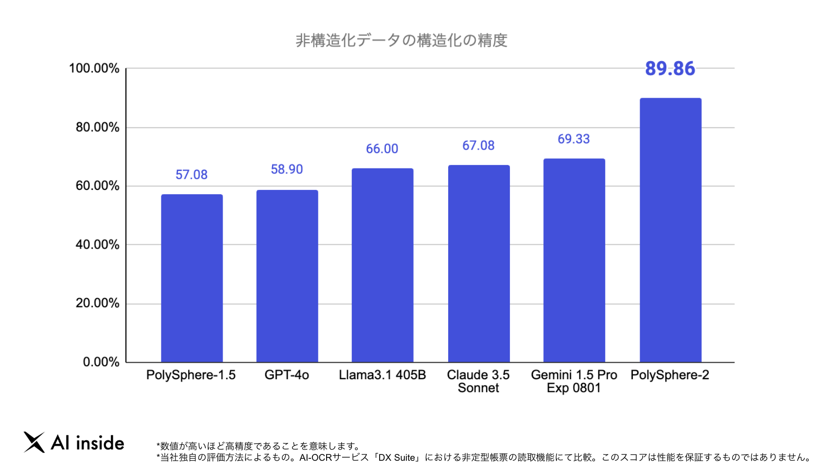2023年6月にローンチした独自LLM「PolySphere-1」に、AI inside が保有するデータを用いて学習を重ねたことで、さらに高性能に進化した「PolySphere-2」を他社LLMと性能検証した結果*1、非構造化データを構造化する精度において、最新の他社LLMを最大30%上回る性能となりました。