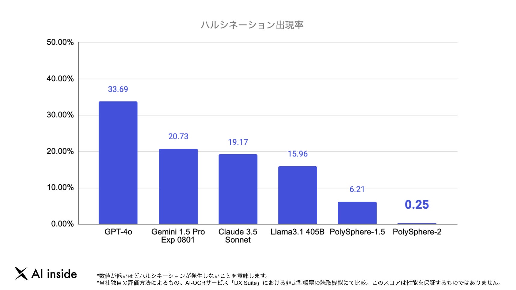 また、生成AIならではの課題であるハルシネーションにより起こる回答結果の揺れにも技術的に対応し、ハルシネーション出現率において、「PolySphere-2」は0.25%と他社LLMに比べて遥かに良いスコアでハルシネーション低減を実現しています。