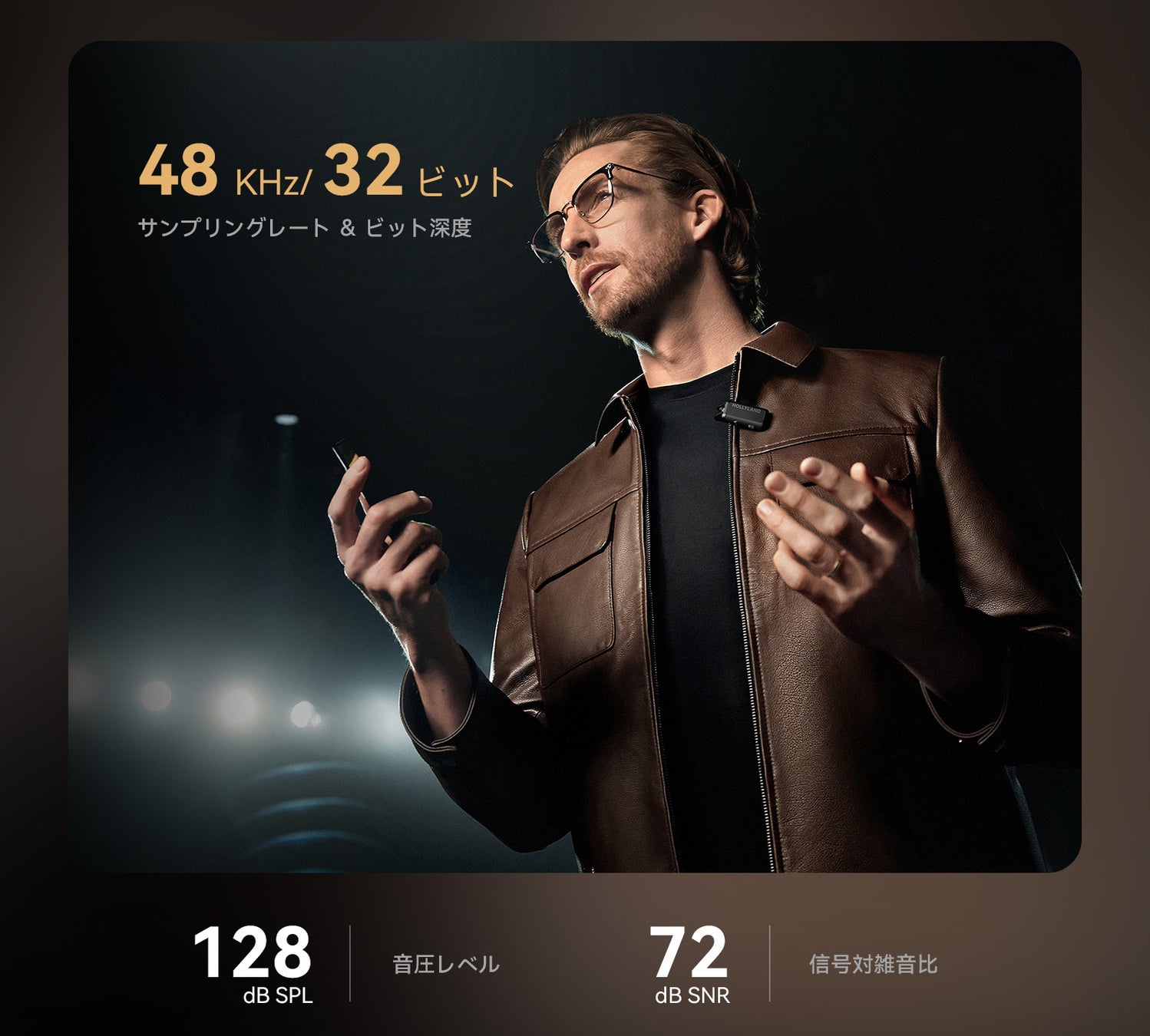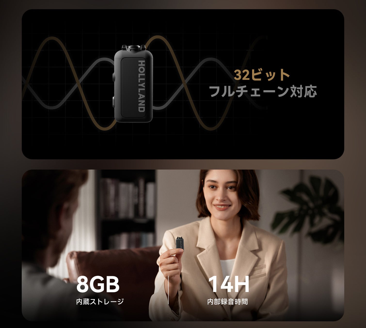 また、「収音(マイクカプセル)→32ビットフロート処理→ワイヤレス伝送→AIノイズキャンセリング→モニタリング→録音」までを一貫して同じビット深度・クオリティで扱い、音声信号の品質を損なわずに一連の工程を完結可能です。