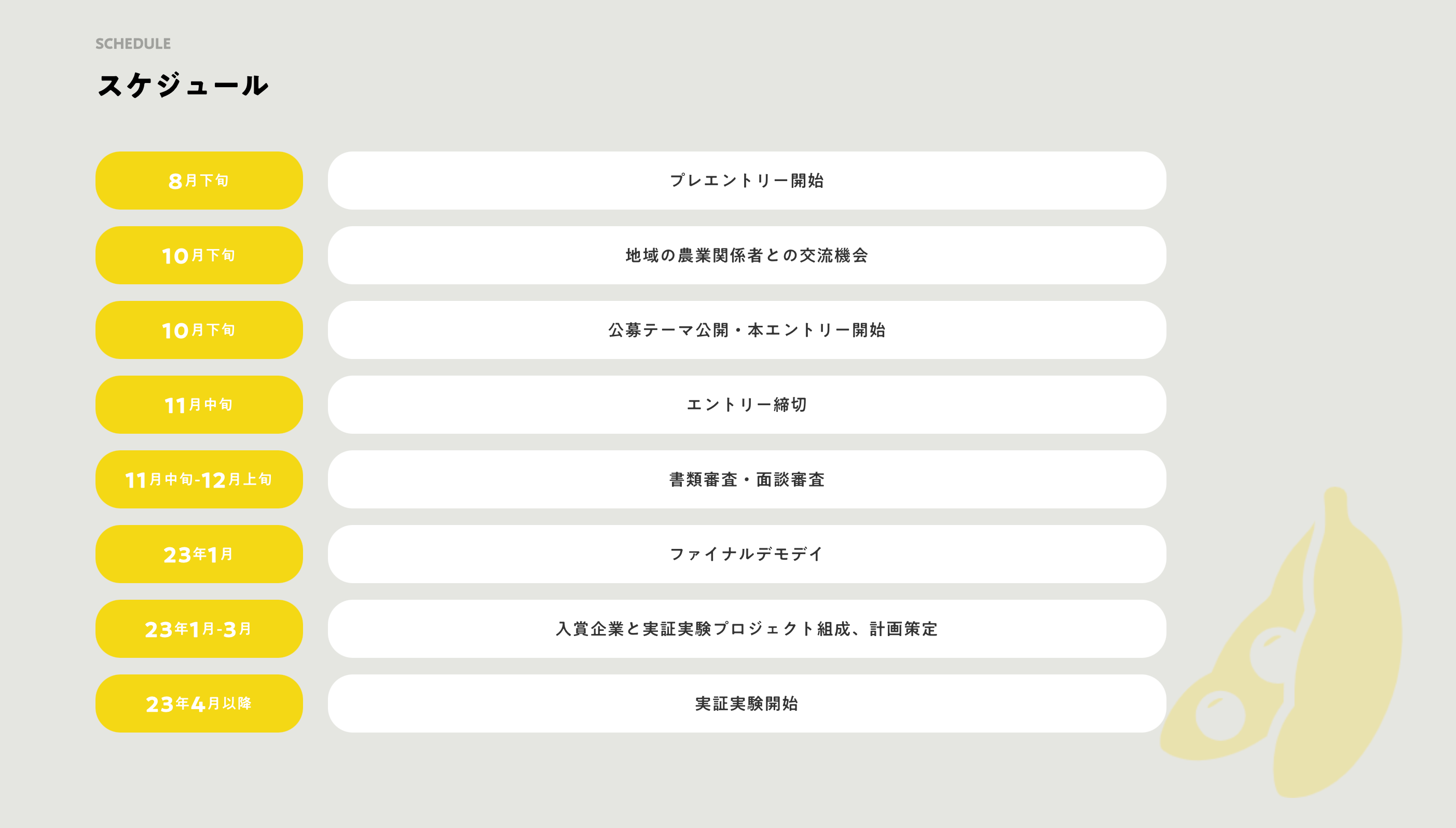 生産者や農業団体、農業系事業会社などが抱えるこうした課題の解決や改善に取り組むスタートアップ(個人、法人)の参加を待っています。