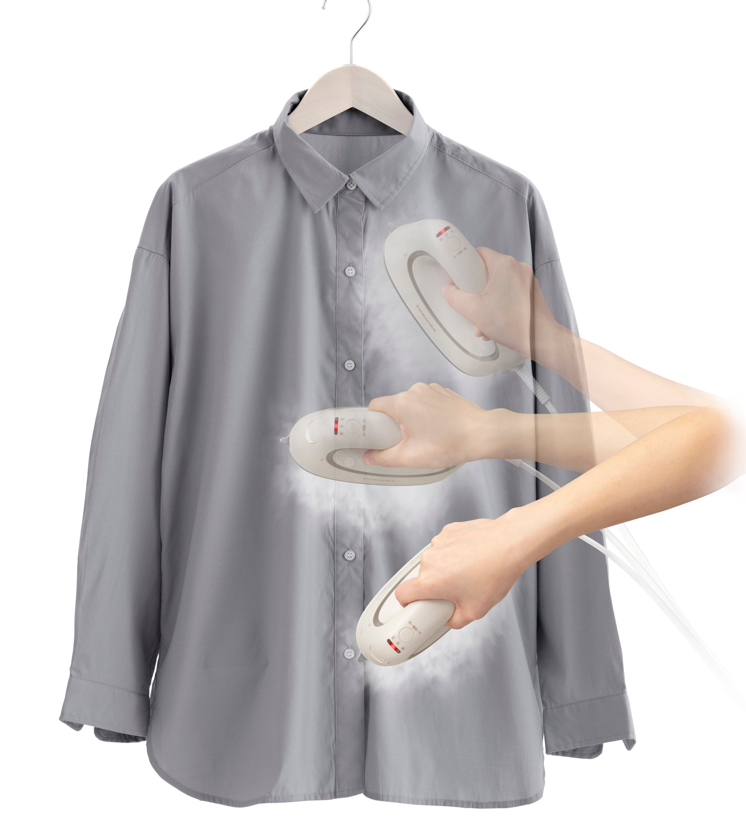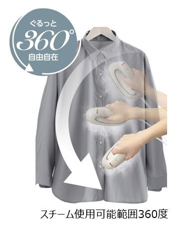 また、水タンク内の給水管を新開発したことで、スチーム使用可能範囲が360度まで拡大。ハンガーにかけた衣類をケアする際の手首の動きに連動して、スチームを安定して噴射できるため、製品本体の向きを気にすることなくスムーズに使うことができます。