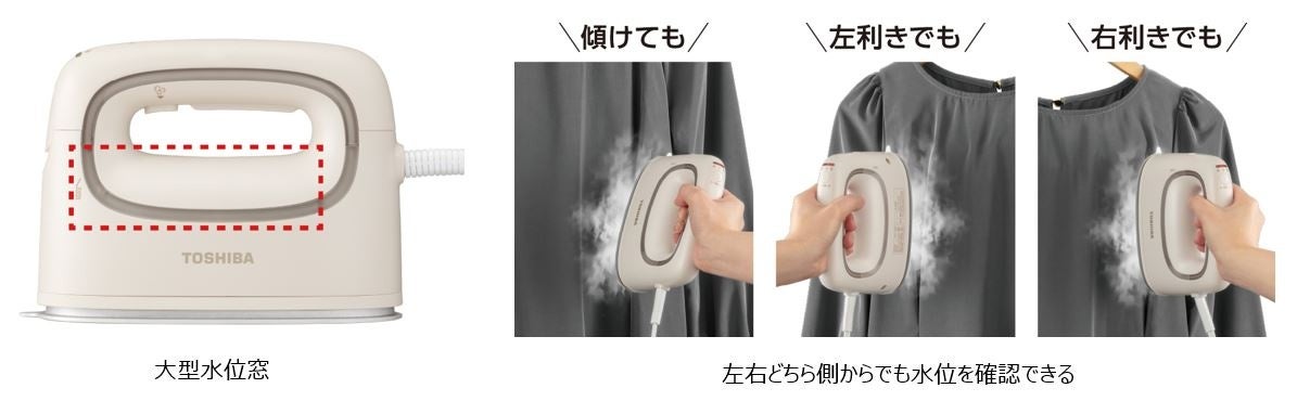 さらに、使用時や注水時に水位が見やすい大きな水位窓を採用したほか、製品高さを抑え製品重心を手元に近づけることで取り回しの良さを改善、水タンク容量を拡大してスチーム連続使用時間を約14分20秒[注4]にするなど、さらに使い勝手を向上させました。